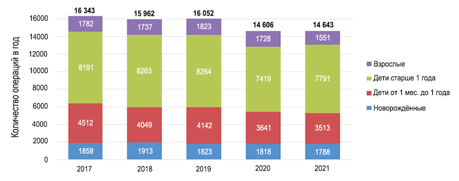 В России только за 2022 г. родилось около 14 тыс. детей с ВПС. Потребность в хирургическом вмешательстве уже на первом году жизни крайне высока и варьирует от 60 до 70%, остальные дети нуждаются в операции после достижения ими возраста 12 месяцев [4]. Особое место среди врождённых пороков сердца занимают критические ВПС периода новорождённости (25% всех случаев, около 3.5 тыс. детей в год). Согласно раннее опубликованной информации, кардиохирургическая помощь в неонатальном периоде оказывается 1.7–1.8 тыс. новорождённым [5]. В 2021 г. в России было прооперировано 4847 детей первого года жизни. Более 90% операций, в том числе у 1788 новорождённых, выполнено в 12 из 36 медицинских организаций, объём работы которых составляет свыше 200 хирургических вмешательств в год. При этом количество хирургических коррекций ВПС за последние пять лет имело отрицательную динамику во всех возрастных группах (рис. 1).
