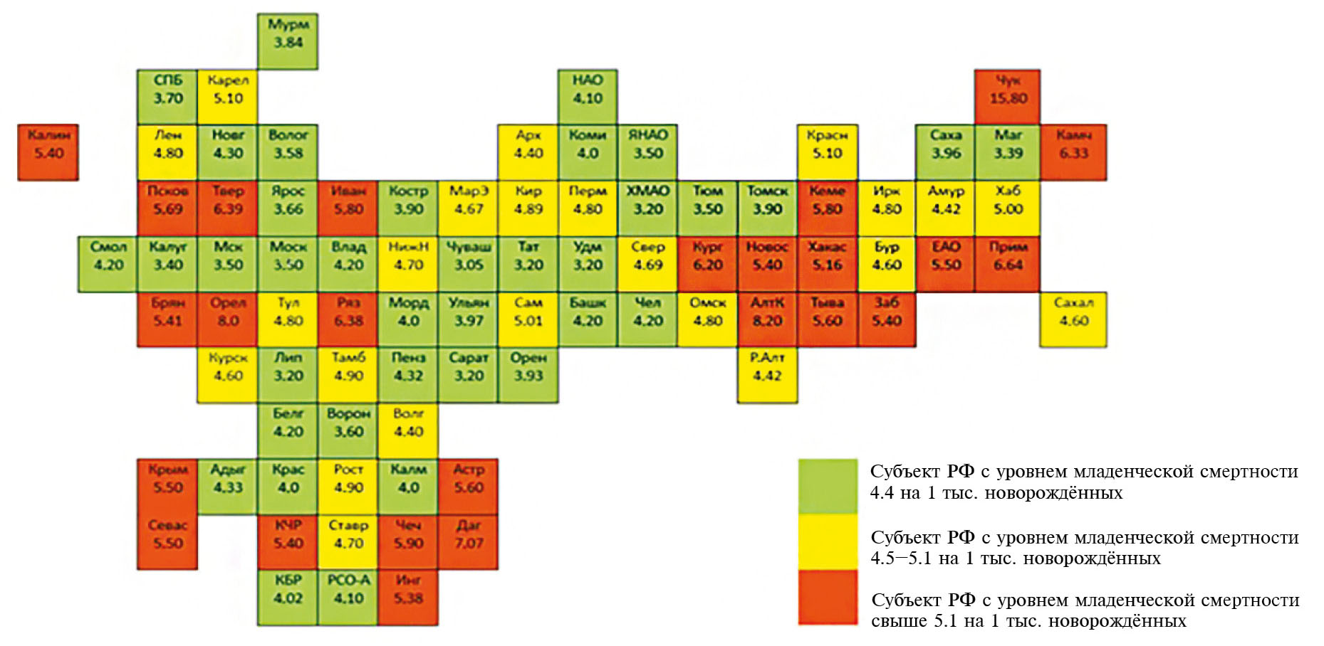 Возвращаясь к ситуации в России, следует назвать 17 регионов с наиболее высокой младенческой смертностью при одновременной нехватке специалистов: Кемеровская, Курганская, Орловская, Псковская, Рязанская, Тверская области, Алтайский, Забайкальский, Камчатский, Приморский края, республики Ингушетия, Крым, Тыва, Карачаево-Черкесская, Чеченская, Хакасия, Чукотский автономный округ. Республика Дагестан могла бы пополнить этот список по показателю смертности, однако не предоставила данных о практикующих здесь детских кардиологах. Нет точных данных по Самарской области. В Ивановской и Брянской областях, а также в Республике Карелия специалистов достаточно, но статистика младенческой смертности неутешительная, что требует анализа эффективности работы врачей. Астраханская область с учётом плотности населения находится в числе лидеров по количеству детских кардиологов, уступая только Саратовской области и Санкт-Петербургу. Тем не менее по уровню смертности регион нельзя назвать благополучным, несмотря на наличие здесь федеральной кардиохирургической клиники. В связи с этим требуется тщательный анализ эффективности и безопасности кардиологической и кардиохирургической помощи. Не всегда можно судить о качестве оказания помощи детям с врождёнными пороками сердца только на основании обеспеченности населения врачами. Но сам факт наличия детской кардиологической службы способствует более интенсивному обмену данными по сложным пациентам между различными региональными учреждениями и более активной тактике их ведения. С момента утверждения в России специальности “детская кардиология” в начале 2010-х годов стала заметно снижаться детская смертность не только от болезней системы кровообращения, но и в целом.