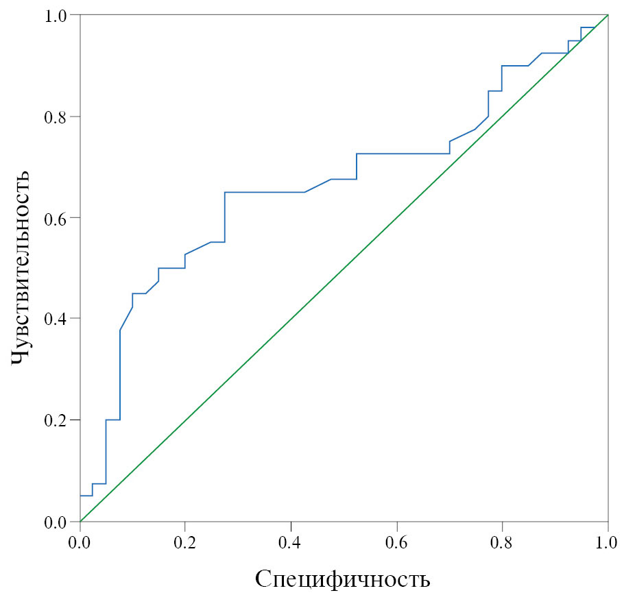 Регрессионный анализ показал, что разделение регионов на группы в зависимости от обеспеченности детского населения кардиологами коррелирует с уровнем младенческой смертности (рис. 3). С помощью предсказательной модели обнаружена статистически достоверная взаимосвязь между долей специалистов на 10 тыс. детей и вероятностью попадания региона в группу с уровнем младенческой смертности выше среднего (р = 0.015). AUC-модель равнялась 0.664 (95% ДИ 0.54–0.78), чувствительность и специфичность – 75 и 57.5% соответственно при пороговом значении 0.28 из расчёта на 10 тыс. детей. Таким образом, большее число врачей рассматривается как статистически достоверный предиктор снижения вероятности попадания региона в группу с летальностью выше среднего по России.