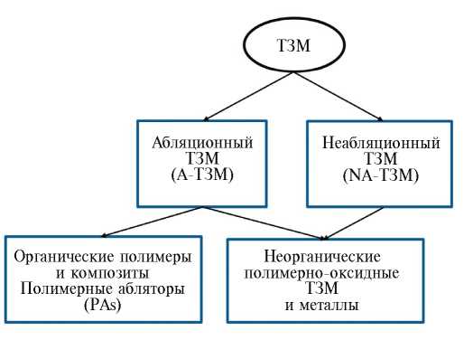 Теплозащитные покрытия изготавливаются из специальных теплозащитных материалов (ТЗМ) [1], которые делятся на два класса: абляционные и необляционные. В обобщённом виде классы ТЗМ представлены на рисунке 1. Неабляционные ТЗМ предназначены для изоляции тепла за счёт явления переизлучения. Эти материалы производят преимущественно с использованием керамики или металлов, например, вольфрама или рения [2]. Абляционные ТЗМ позволяют создавать такие условия протекания внутрикамерных процессов в ракетных двигателях, при которых реализуется пассивное охлаждение внутренних стенок конструкции.