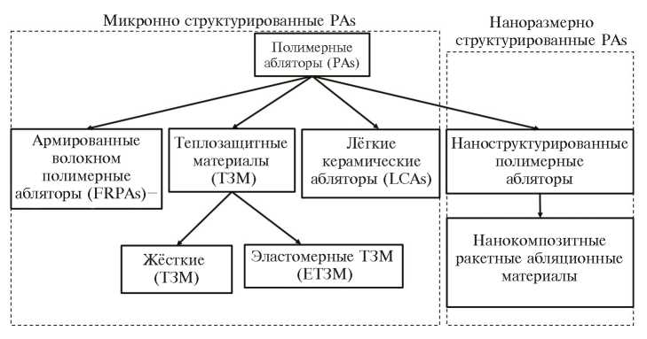 Успешно используются в качестве абляционных ТЗМ и некоторые неполимерные материалы, например неорганические полимеры – керамика или металлы [1]. По сравнению с неорганическими полимерами, то есть полимерами со скелетной структурой без присутствия атомов углерода, полимерные абляционные материалы (PAs − Polymeric Ablatives) обладают определёнными преимуществами: высокой стойкостью к тепловому удару, низкой плотностью, механической прочностью и хорошими теплоизолирующими свойствами. Из-за своей способности адаптироваться к широкому спектру различных гипертермических сред полимерные абляторы типа PAs к настоящему времени стали самым большим и универсальным классом ТЗМ, основные подклассы которого приведены на рисунке 2 [1].