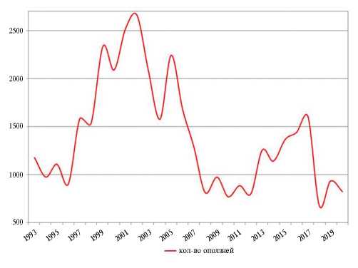 Среднегодовое количество зарегистрированных оползневых явлений на территории России составляет порядка 1500, ходя в отдельные годы отмечаются всплески до 2.5−2.8 тыс. (рис. 2). Этот временной ряд напоминает спектр нерегулярной динамической нагрузки, отражая сложным образом сочетающиеся вариации климата, проявления сейсмической активности и техногенные воздействия. В этом ряду выделяются, конечно, грандиозные оползни. Так, смещение Буреинского оползня 11 декабря 2018 г. привело к образованию завальной плотины высотой более 50 м и шириной до 550 м, перекрывшей долину р. Бурея, что потребовало создания искусственного прорана. А общий объём горных пород, вовлечённых в смещения на всех стадиях образования оползня, оценён суммарно в 25 млн м3 [1].