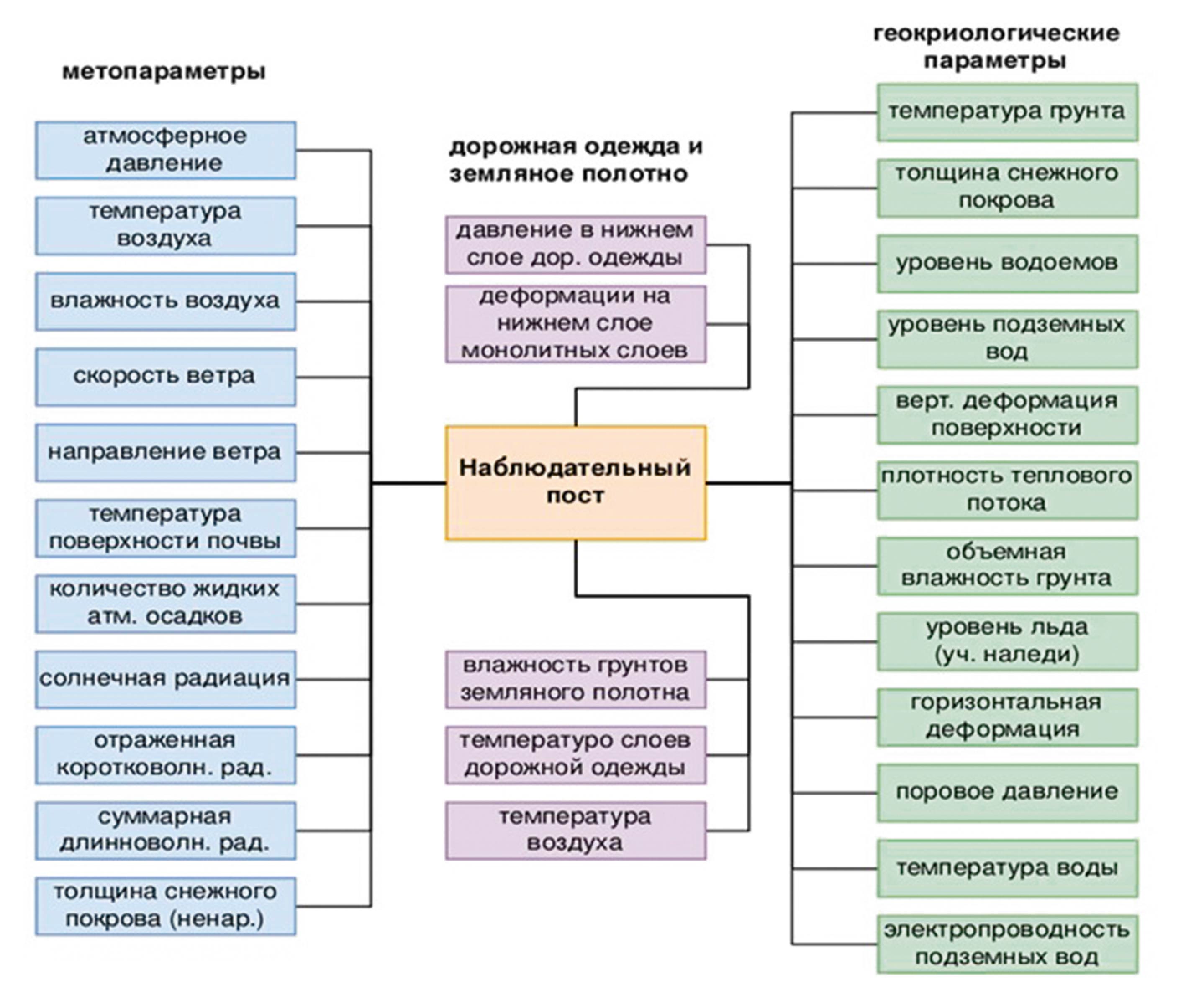 В этой связи следует отметить пионерные работы 2022−2023 гг. Института геоэкологии РАН в сотрудничестве с Институтом мерзлотоведения СО РАН и организациями дорожной отрасли по разработке методического обеспечения организации стационарных постов мониторинга состояния мёрзлых грунтов и активности геокриологических процессов на трассах федеральных автодорог в криолитозоне. На рисунке 5 представлен перечень контролируемых на таком посту параметров окружающей среды. Несколько подобных постов уже функционируют [7].
