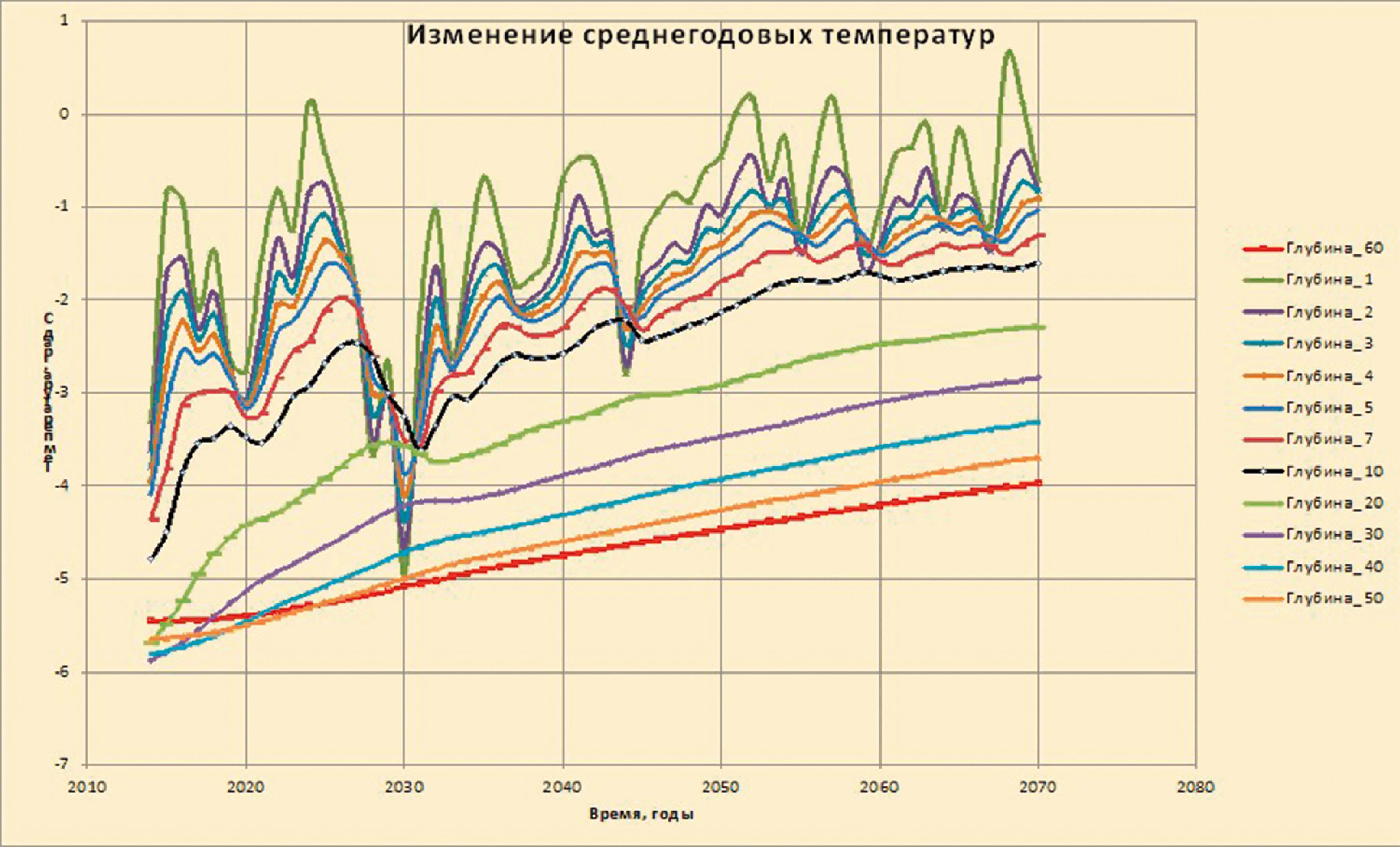 Рис. 6. Прогноз изменения температур грунта на разных глубинах для условий Центрального Ямала: сценарий RCP 8.5, глубина в метрах обозначена цветом, ненарушенные условия Источник: [9].