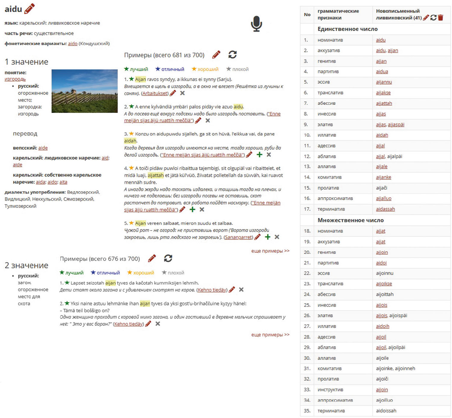 На основе данных корпуса разрабатываются приложения с интуитивно понятным интерфейсом для широкого круга пользователей, интересующихся прибалтийско-финскими языками Карелии, например, мультимедийный словарь карельского языка ливвиковского наречия LiPaS (от карел. “lipas” – сундучок, шкатулка) (рис. 10). Его целевая аудитория – школьники, студенты, слушатели курсов карельского языка и преподаватели. Словник формируется автоматически из текстов корпуса и постоянно пополняется по мере загрузки новых данных. Программа также предлагает иллюстративный материал (контекстные примеры) для каждого слова. Задача редактора – проверить правильность заполнения страницы словарной статьи, отобрать наиболее удачные примеры и снабдить их переводом на русский язык. Работа по наполнению мультимедийного словаря LiPaS и созданию новых словарей (для других нормированных вариантов) продолжается. Подобные приложения позволяют компенсировать ограниченность информации традиционных бумажных словарей, что особенно актуально при изучении языка.