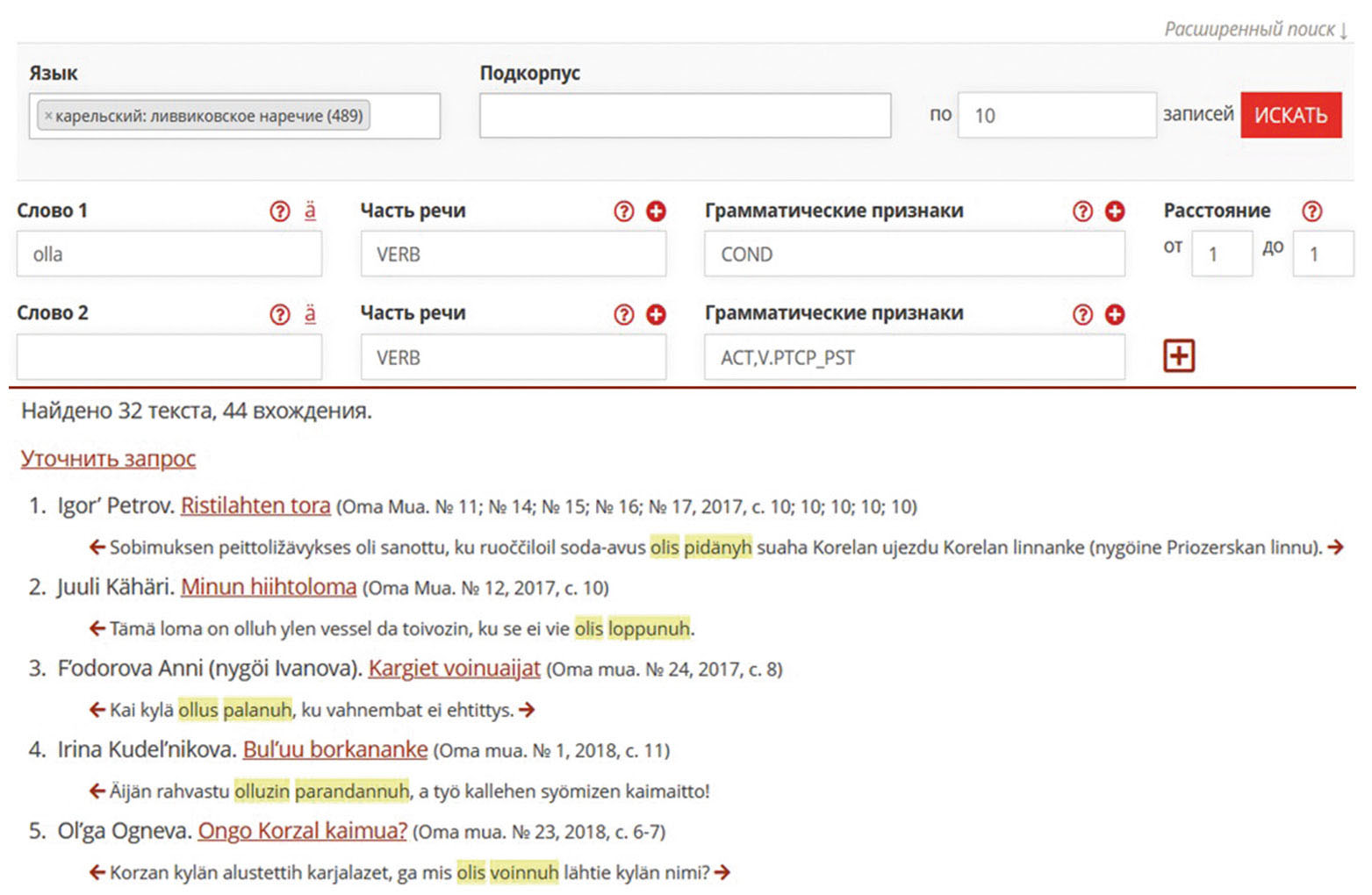 Рис. 6. Пример подбора ливвиковских глаголов в форме перфекта кондиционала с помощью системы лексико-грамматического поиска ВепКара