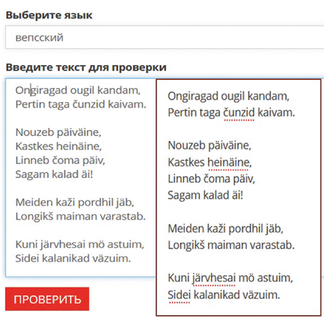 Материалы корпуса внесли большой вклад в подготовку “Орфографического словаря вепсского языка” [12] и “Грамматико-орфографического словаря карельского языка” [13]. Кроме того, создано приложение по проверке орфографии обоих языков (рис. 7).