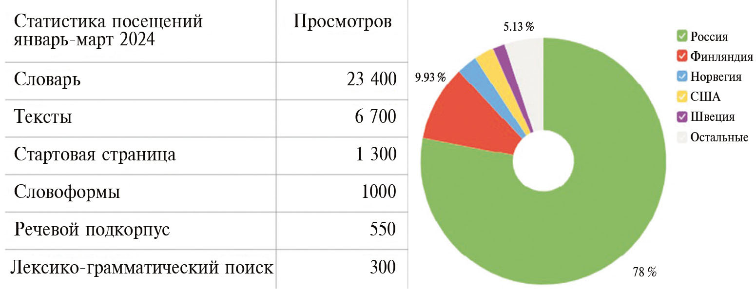 Популяризация карельского и вепсского языков. Многофункциональность корпуса ВепКар заключается в том, что, кроме исследовательских задач, он может активно применяться рядовыми пользователями в качестве электронной библиотеки, полноценного электронного словаря или универсального обучающего ресурса. О востребованности корпуса свидетельствует статистика посещений (рис. 8, 9). Например, за первый квартал 2024 г. зафиксировано более 2.5 тыс. визитов на сайт (без учёта роботов), из которых около 1 тыс. – уникальные посетители. Основную аудиторию ресурса ожидаемо составили пользователи из России и Финляндии – стран, где проживает карелоязычное население.