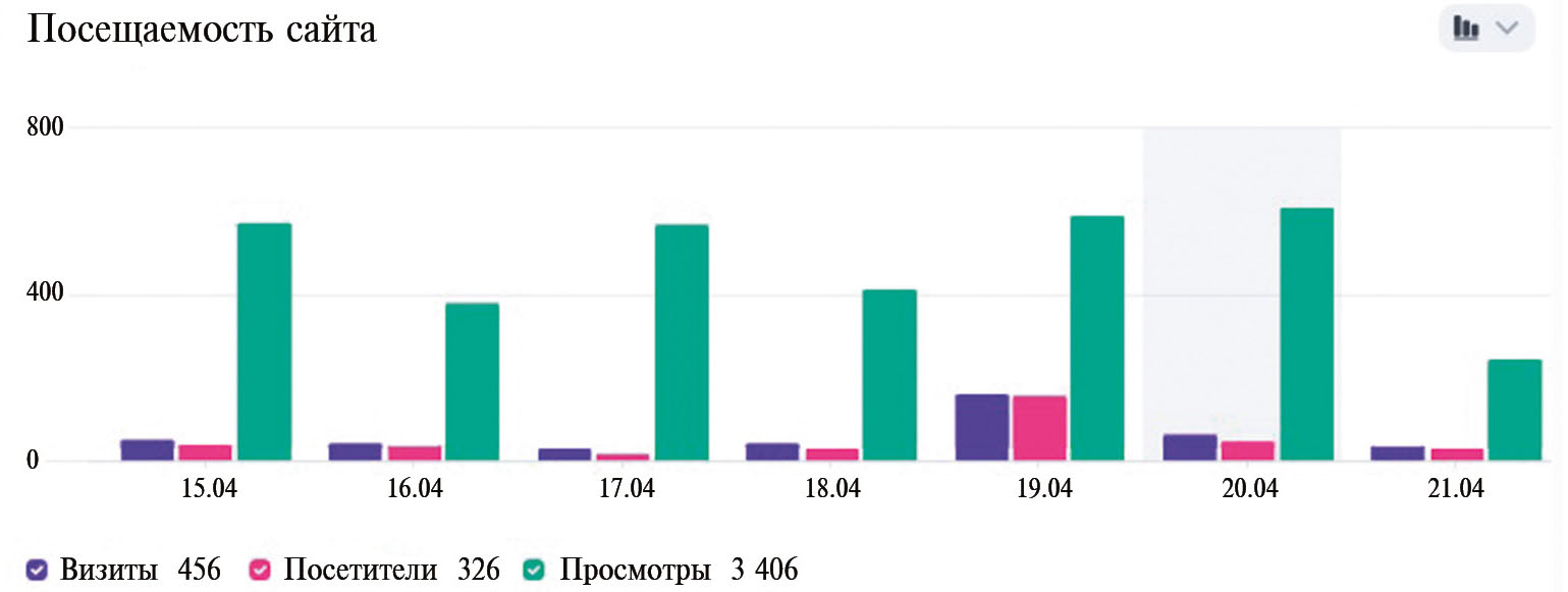 Рис. 9. Посещаемость корпуса за неделю 15.04.2024 г. – 21.04.2024 г. Резкое увеличение числа визитов и посетителей 19.04.2024 г. связано с проведением всероссийской акции “Диктант на карельском и вепсском языках”
