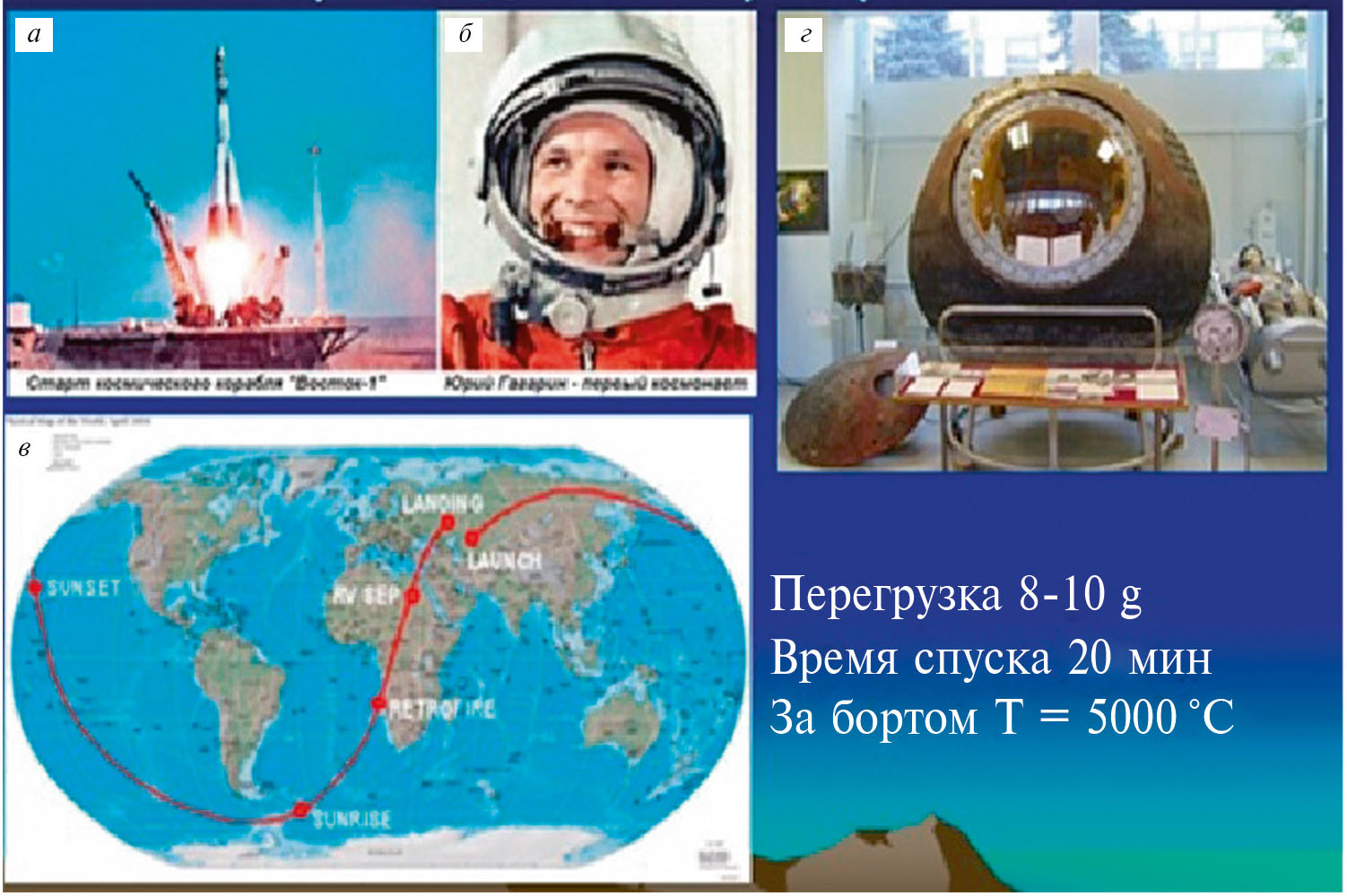 Рис. 5. Полёт Ю.А. Гагарина 12 апреля 1961 г.: а − старт ракеты-носителя “Восток”; б – космонавт в скафандре перед стартом; в − траектория полёта; г − спускаемый аппарат корабля “Восток” в музее РКК “Энергия” им. С.П. Королёва