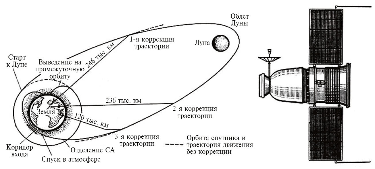 Космический аппарат “Зонд-5” (15−21 сентября 1968 г.) впервые в мире облетел Луну и вернулся к Земле со 2-ой космической скоростью. На рисунке 6 приведена схема траектории полёта аналогичного КА “Зонд-6”, совершившего управляемый спуск в атмосфере. Для пилотируемого варианта КА “Зонд” была разработана система автономной навигации “Альфа” с использованием автономных оптических измерений с помощью секстанта и отечественной бортовой цифровой вычислительной машины (БЦВМ) “Салют-1” [11].