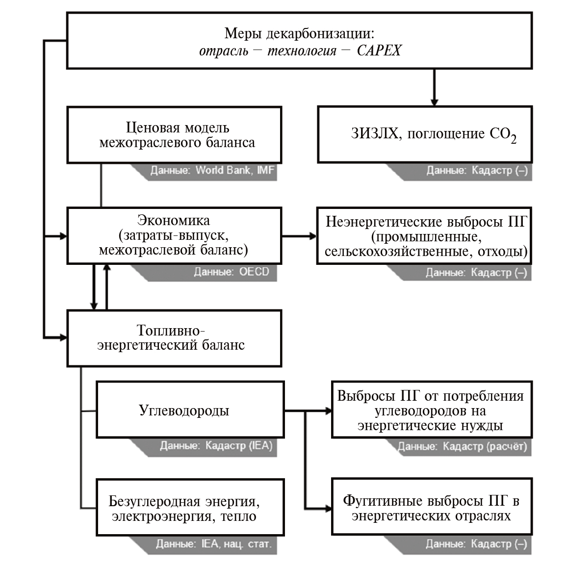 Главный элемент подхода – статическая межотраслевая макроструктурная модель размерностью 45 отраслей, которая дополнена ценовой моделью межотраслевого баланса, подробным блоком формирования топливно-энергетического баланса (ТЭБ) и блоком расчёта выбросов парниковых газов. Источники статистических данных для модельных стран унифицированы. Межотраслевые балансы (МОБ) основаны на данных OECD 3; при построении ценовой модели, помимо МОБ, дополнительно учтены валютные курсы IMF и индексы World Bank по мировым и импортным ценам на отдельные товары. Часть ТЭБ, описывающая баланс углеводородов, строится либо на Национальных кадастрах антропогенных выбросов из источников и абсорбции поглотителями парниковых газов 4, либо на балансах IEA 5 в случае отсутствия в стране кадастра 6. Части ТЭБ, описывающие балансы электроэнергии, тепла, безуглеродной энергии, построены либо согласно официальной национальной отчётности, либо на балансах IEA. Источником данных по выбросам парниковых газов служат кадастры. В случае отсутствия кадастра рассчитываются только выбросы парниковых газов от сжигания топлива, а результат верифицируется с экспертными оценками.