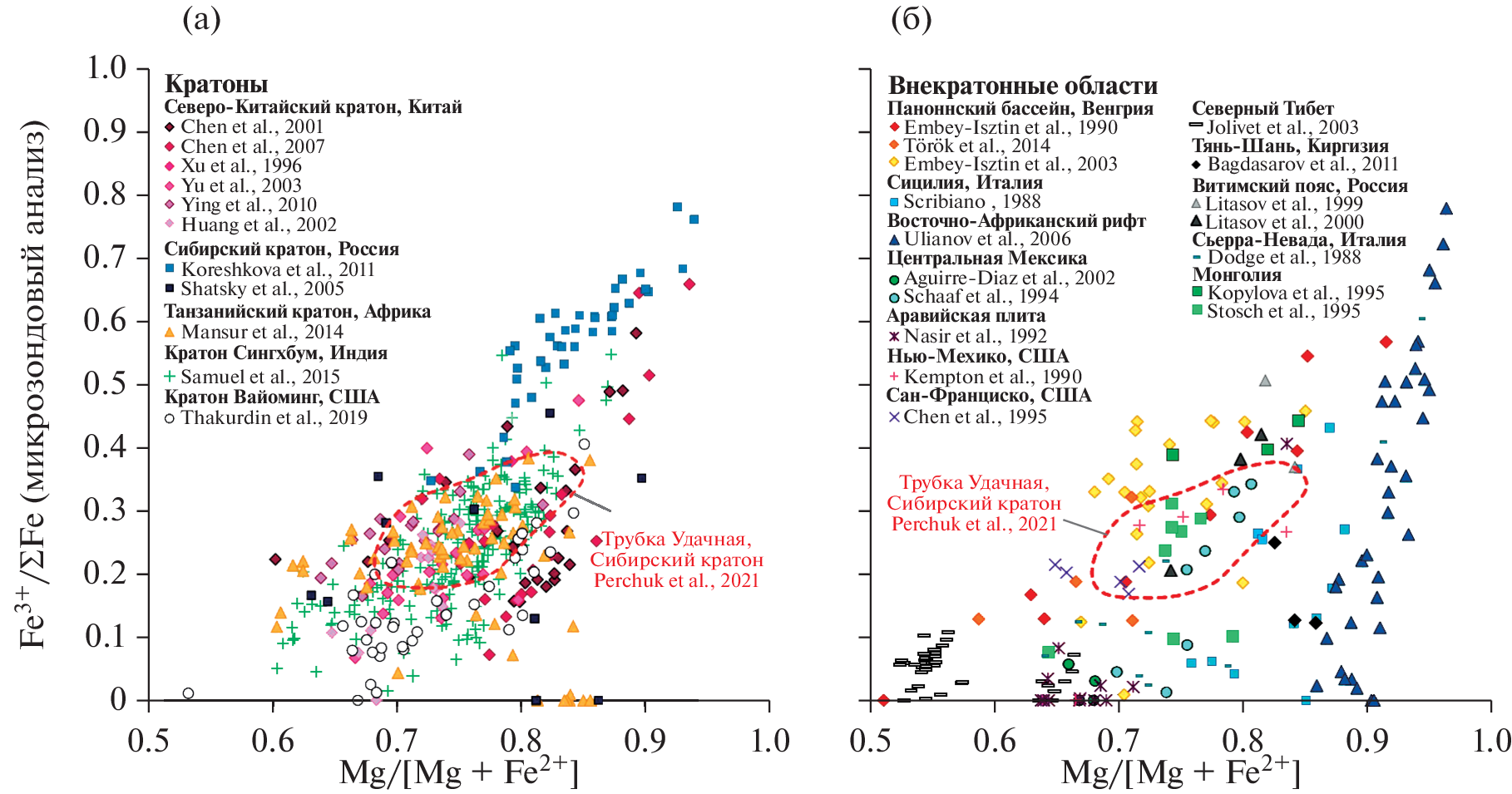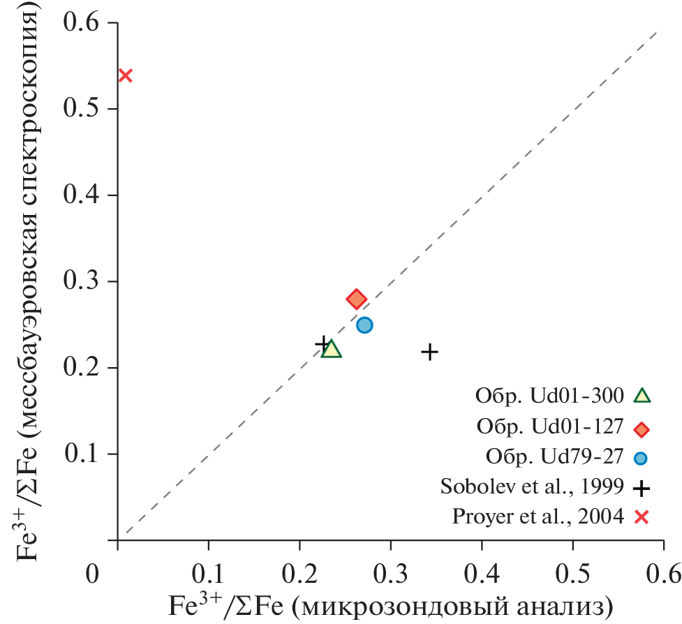 - Sobolev V.N., McCammon C.A., Taylor L.A. et al. Precise Mössbauer milliprobe determination of ferric iron in rock-forming minerals and limitations of electron microprobe analysis // Amer. Mineral. 1999. V. 84. № 1–2. P. 78–85.