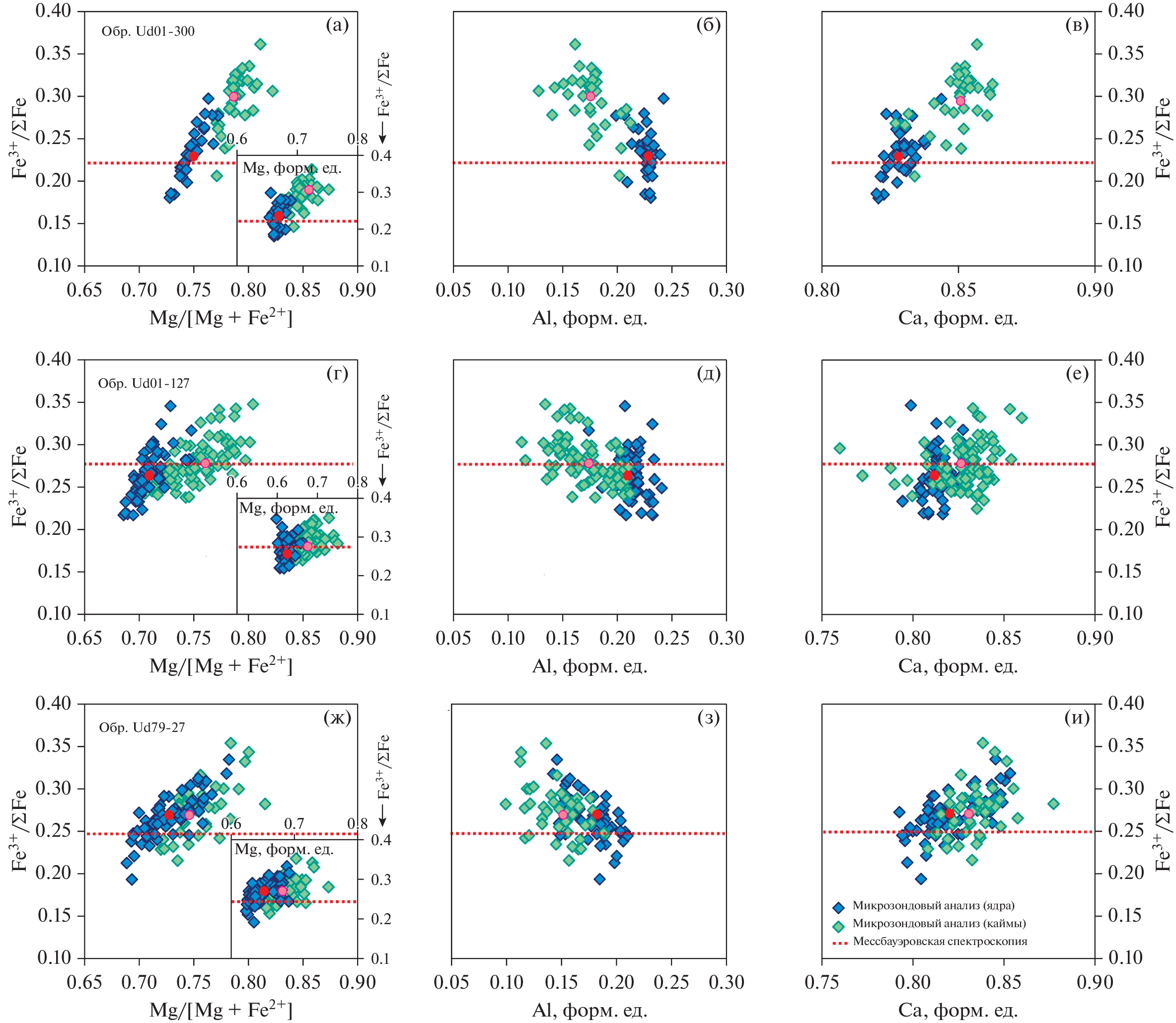 The aegirine end-member (NaFe3+Si2O6) in clinopyroxenes resulted from incorporation of Fe3+ into the mineral structure effects the accuracy of reconstruction of the P-T conditions in the high-grade metamorphic rocks and also allows evaluation the redox conditions of their formation. As a rule, the content of this end-member in clinopyroxenes is evaluated based on the crystal chemical recalculations of microprobe analyses. However, in some publications on eclogites, the results of recalculations of clinopyroxenes were compared with the data of Mössbauer spectroscopy. Significant difference was revealed between the measured and calculated Fe3+/ΣFe ratios, that can significantly affect the results of geothermometry. This paper presents the results of the Mössbauer spectroscopy measurements of clinopyroxene fractions separated from three samples of garnet-clinopyroxene granulites from the Udachnaya kimberlite pipe. The ratios Fe3+/ΣFe = 0.22–0.26 measured in clinopyroxenes correspond to 6–10 mol. % aegirine. These estimates are in good agreement with the values obtained for clinopyroxenes from the same samples by the recalculation of microprobe analyzes using the charge balance method. Following to this conclusion, we believe that crystal chemical recalculations of microprobe analyzes of clinopyroxenes from non-eclogitic rocks make it possible to correctly estimate the Fe3+ content in them. Similar recalculation of microprobe analyzes of clinopyroxenes from crustal xenoliths from other localities, as well as from ferrobasalts of the continental flood basalts provinces, ferrodolerite dikes, and gabbroid xenoliths (similar in bulk chemical composition to many lower-middle-crustal xenoliths) revealed significant amounts of previously unaccounted aegirine in them (up to 13 and 4–9 mol. %, respectively), that unleashes the potential for the reconstruction of redox conditions in many rocks.