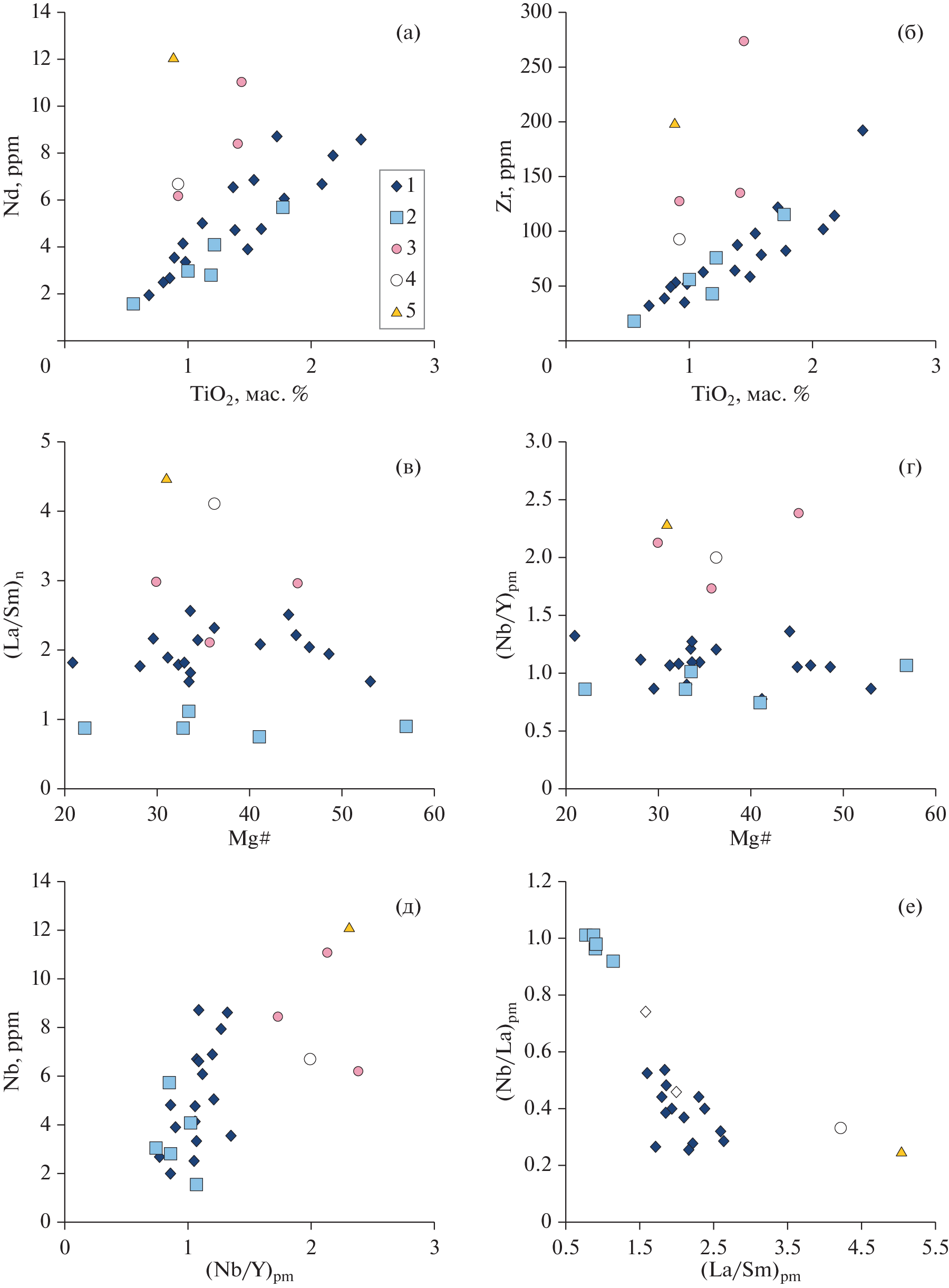 The paper presents geochemical and isotopic characteristics of Neoarchean (2.7–2.66 Ga) mafic granulites of the Sharyzhalgay uplift in the southwestern Siberian craton. Mafic and predominant felsic granulites compose fragments of the metamorphic complex among the Neoarchean and Paleoproterozoic granitoids. Mafic granulites are characterized by the mineral association Cpx + Pl ± Hbl ± Opx ± Qz and include two types with different major and immobile trace element contents. The dominant rocks of the first type have a wide range of Mg# and concetrations of TiO2 and immobile trace elements (REE, Zr, Nb, and most positive εNd(Т) va-lues. The first type of mafic granulites show elevated (La/Sm)n and enrichment in Th and LREE relative Nb which is typical of basalts of subduction origin or crustal contaminated basalts. The absence of negative correlation between (La/Sm)n and εNd(Т) and a clear positive correlation of TiO2 with Nb testify against the effect of crustal contamination on the composition of the mafic granulites. The magmatic protoliths of first type of mafic granulites are suggested to form by the melting of depleted peridotites of the subcontinental mantle which metasomatized by melts formed from basalts or terrigenous sediments of the subducting plate. Mafic granulites of the second type have a narrower range of Mg#, TiO2 content, positive εNd(Т), flat rare earth patterns and no subduction signatures, which indicates an asthenospheric depleted mantle source. Ma-fic granulites contaminated by the Paleoarchean crust are characterized by increased (La/Sm)n, depletion of Nb relative to Th and LREE, and negative εNd(Т) values. Post magmatic influence of granitoids lead to the enrichment of mafic granulites in biotite and apatite, an increased in concentrations of K2O, P2O5, a signi-ficant enrichment of Zr, Nb, Th, LREE, and negative εNd(Т) values. The difference between mafic granulites of the first and second types is not resulted from crustal contamination, but is due to the melting of two types of sources: asthenospheric and subcontinental lithospheric mantle. The subcontinental lithospheric mantle of the Irkut block was isotopically depleted for the Neoarchean time (∼2.7 Ga), and its enrichment in incompatible trace elements, presumably by felsic melts generated from the rocks of subducting plate, immediately preceded mafic magmatism.