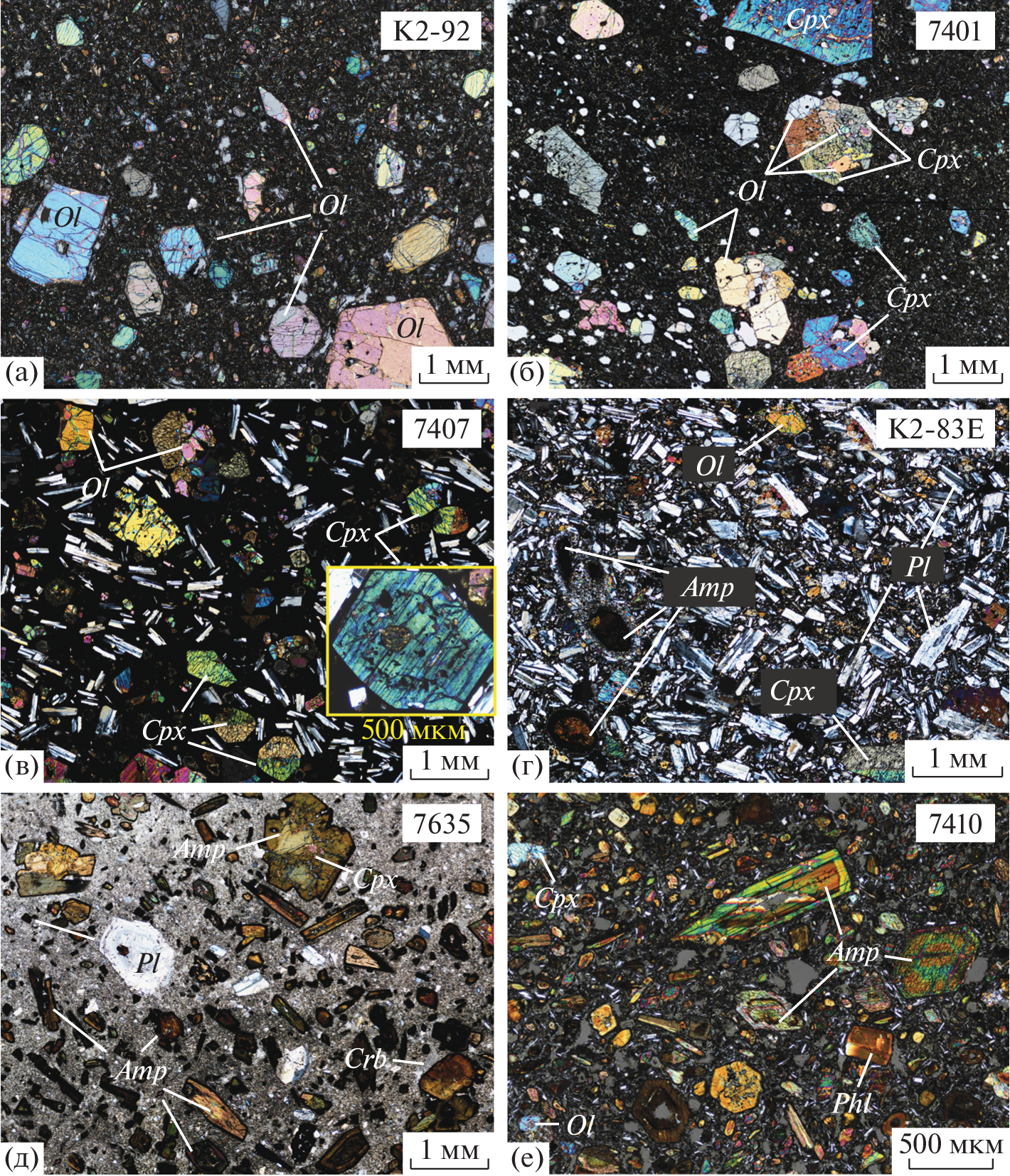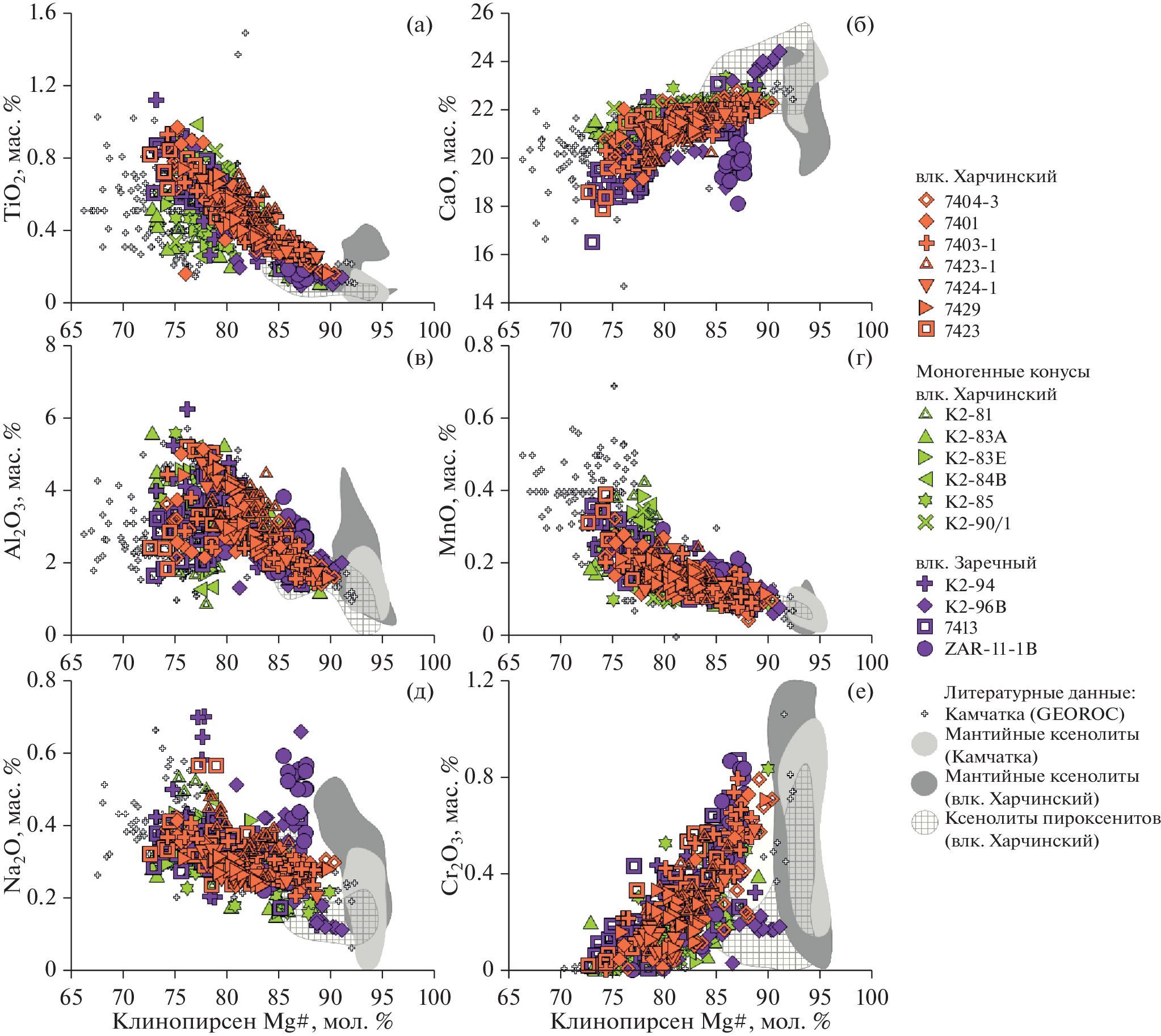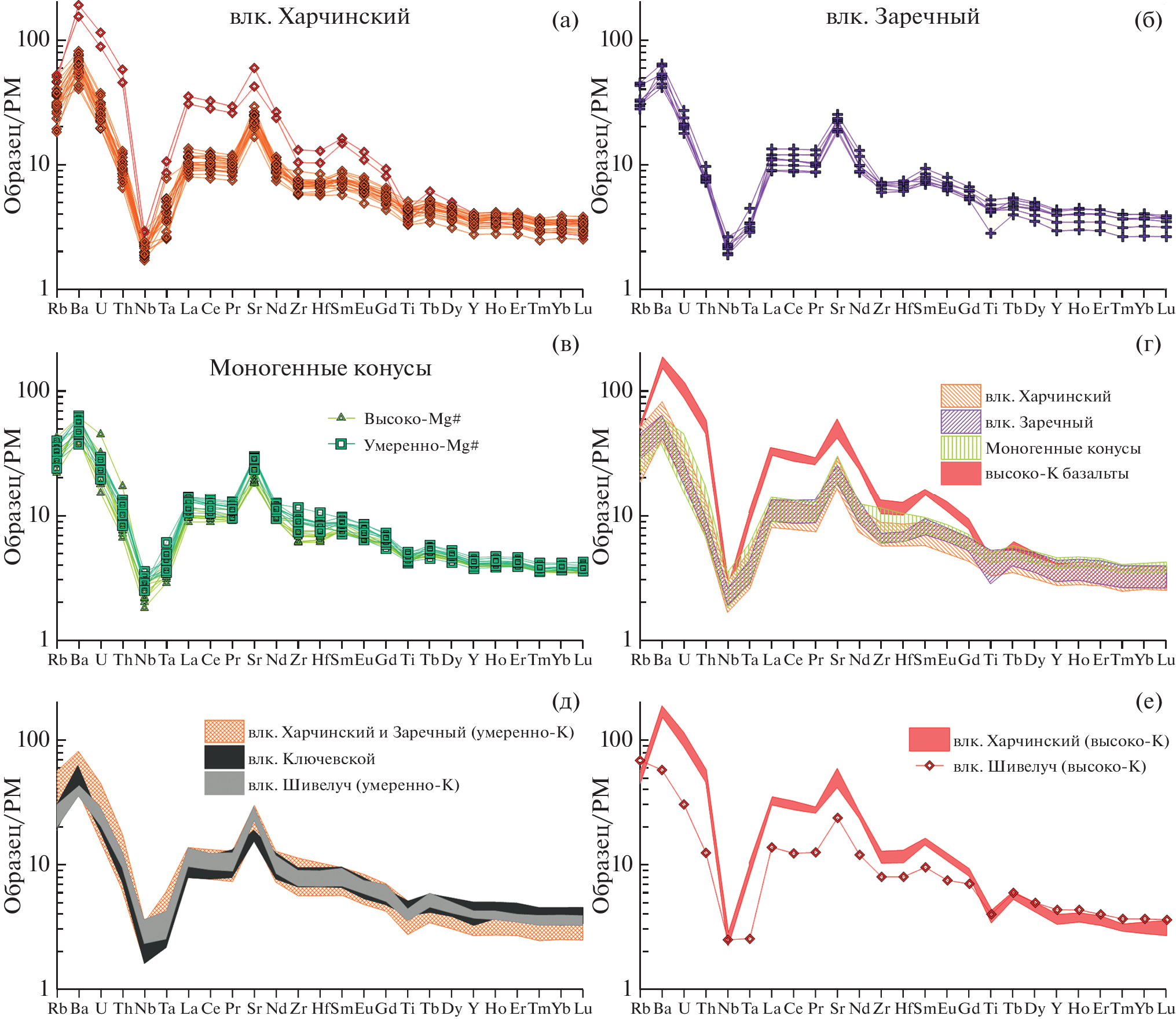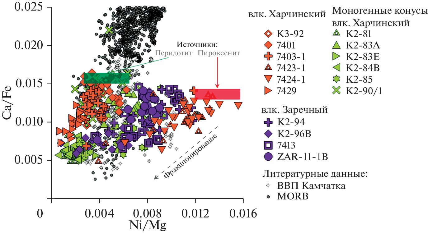 Вулканы Харчинский, Заречный и зона моногенных конусов Харчинского озера – уникальные центры излияния магнезиальных лав в области субдукции северного края Тихоокенской плиты под Камчатку. В статье приведены новые геохимические данные по составу пород (55 образцов) и минералов (более 900 анализов оливина, пироксенов, амфибола и плагиоклаза) этих центров, проанализированных методами РФА и LA-ICP-MS (породы) и электронного микрозонда (минералы). Большая часть изученных пород представлена магнезиальными (Mg# = 60–75 мол. %) умеренно-калиевыми базальтами и андезибазальтами. Умеренно-магнезиальные (Mg# = 52–59 мол. %) андезибазальты присутствуют среди моногенных конусов Харчинского озера. К редким разностям пород относятся высококалиевые базальты-андезибазальты даек в центре постройки влк. Харчинский и магнезиальные андезиты (Mg# = 58–61 мол. %) экструзий влк. Заречный. Большинство изученных пород демонстрирует типичное для островодужных пород обогащение крупноионными литофильными, легкими РЗЭ и обеднение высокозарядными элементами и тяжелыми РЗЭ. Высоко-К базальты и андезибазальты обнаруживают аномальное обогащение Ba > 1000 г/т, Th > 3.8 г/т, U > 1.8 г/т, Sr > 800 г/т, Sr/Y > 50 и легкими РЗЭ (La > 20 г/т) и близки к низкокремнистым адакитам. Базальты и андезибазальты всех изученных объектов содержат высоко-Мg фенокристаллы оливина (до Fo92.6) и клинопироксена (Mg# до 91 мол. %). Породы демонстрируют петрографические и геохимические признаки фракционной кристаллизации, наряду с процессами кумуляции минералов и смешения магм. Часть вкрапленников оливина демонстрирует высокое содержание NiO (до 5000 г/т) и повышенное значение Fe/Mn (до 80), что интерпретировано как свидетельство участия в процессах магмообразования пироксенитового источника. Использование соотношений Ca/Fe и Ni/Mg позволило нам разграничить поля составов и тренды эволюции оливинов, связанных с различными источниками – перидотитовым и пироксенитовым, сформированными в результате реакции перидотитов мантийного клина и высоко-Si расплавов субдуцируемой океанической коры. Полученные данные согласуются с другими свидетельствами плавления краевой части субдуцирующей Тихоокеанской плиты под северным участком Центральной Камчатской депрессии в зоне сочленения Курило-Камчатской и Алеутской островных дуг и свидетельствуют о значительной гетерогенности мантии в этом районе.