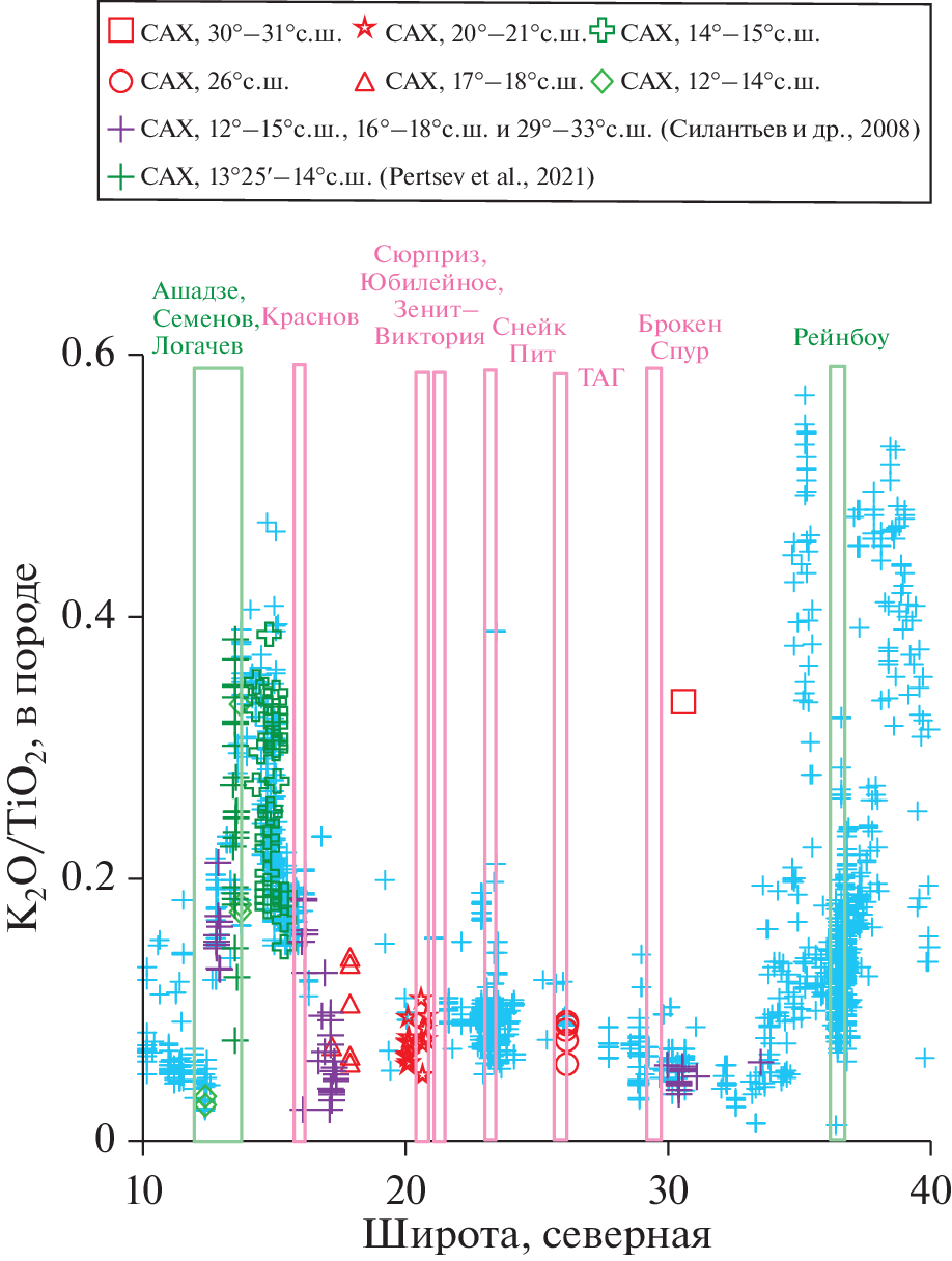 - Andreani M., Escartin J., Delacour A. et al. Tectonic structure, lithology, and hydrothermal signature of the Rainbow massif (Mid-Atlantic Ridge 36°14' N) // Geochem. Geophys. Geosyst. 2014. V. 15. P. 3543–3571.