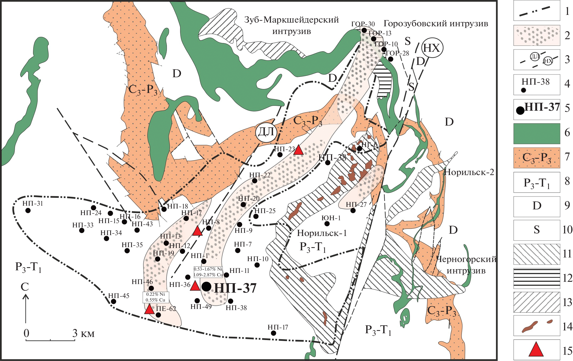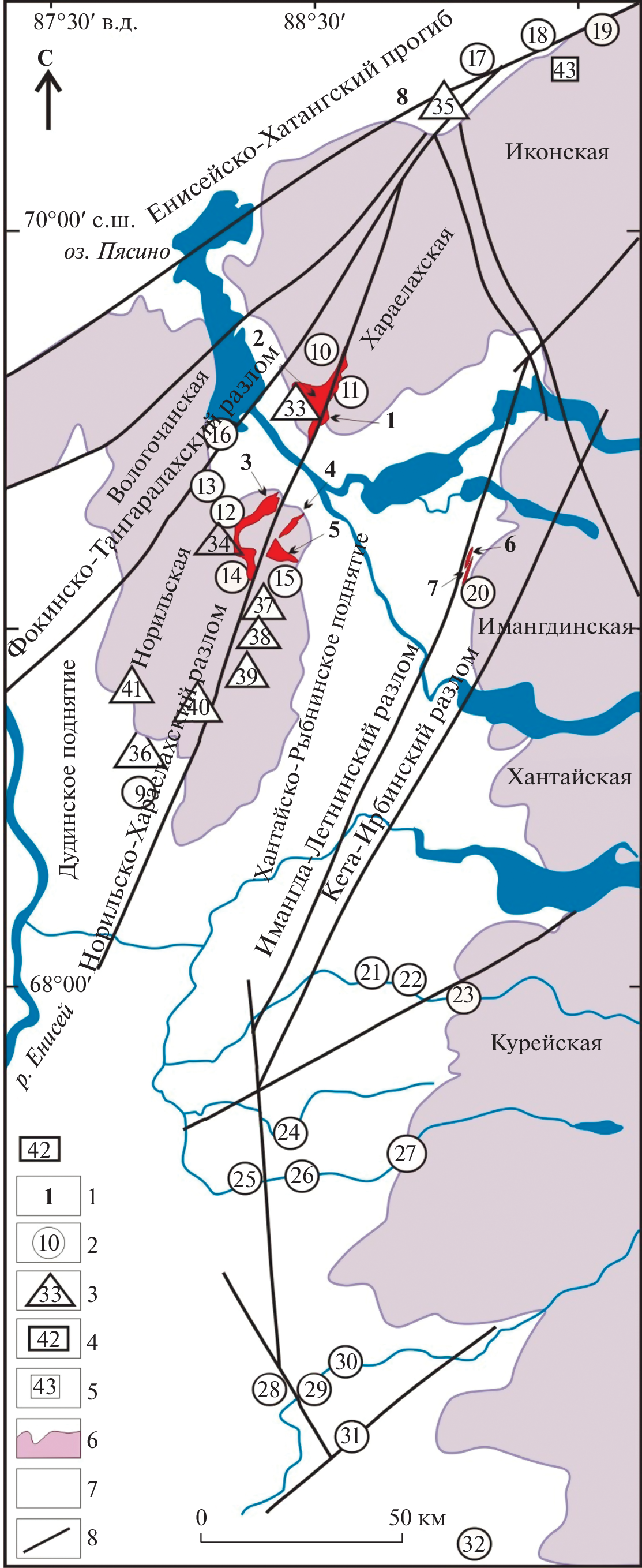 - Czamanske G.K., Wooden J.L., Walker R.J. et al. Geochemical, isotopic, and SHRIMP age data for Percambrian basement rocks, Permian volcanic rocks, and sedimentary host rocks to the ore-bearing intrusions, Noril’sk–Talnakh district, Siberian Russia // Int. Geol. Rev. 2000. V. 42. № 10. P. 895–927.