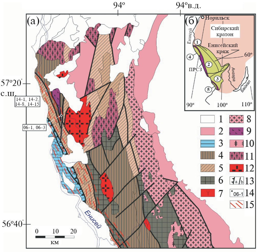 1, 2 – отложения фанерозойского (1) и позднепротерозойского (2) возраста; 3 – офиолиты и островодужные комплексы (NP3); 4 – кузеевский гранулит-метабазит-гнейсовый комплекс (AR?); 5 – енисейский амфиболит-гнейсовый комплекс (PR1); 6 – атамановский гранулит-гнейсовый комплекс (AR?); 7 – сиениты и щелочные граниты (D2–T1–2); 8 – таракский гранитогнейсовый комплекс (PR1); 9 – кимбирский комплекс расслоенных габброноритов (PR1?); 10 – мигматит-гнейсовый комплекс (PR1); 11 – гранитогнейсовый комплекс (MP3–NP1); 12 – комплекс аллохтонных гранитов (PZ1); 13 – тектонические нарушения: надвиги (a), крутопадающие разломы (b); 14 – точки отбора образцов; 15 – бластомилониты и катаклазиты Приенисейской региональной сдвиговой зоны.
