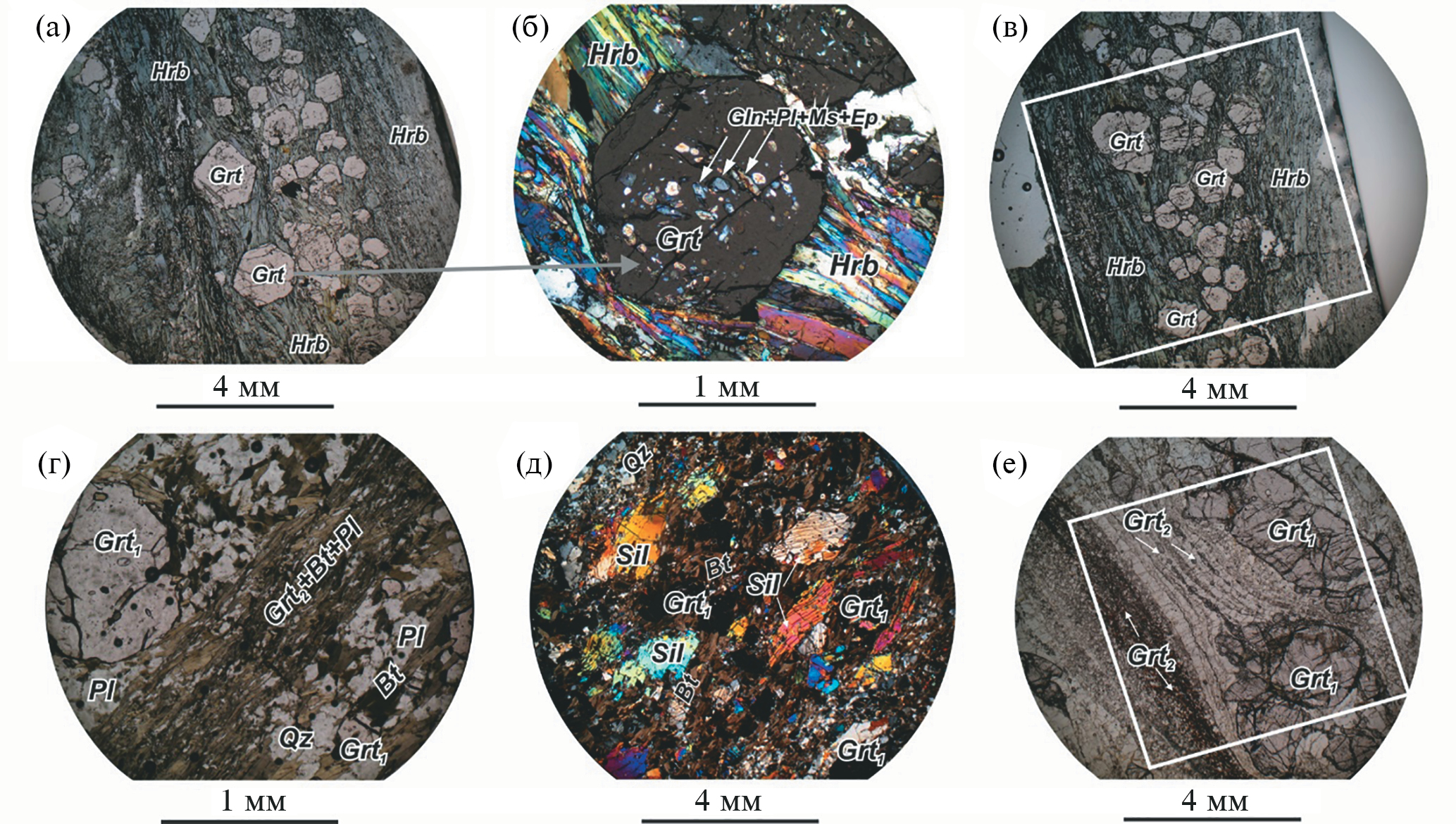 Основными породообразующими минералами бластомилонитов являются гранат, биотит, силлиманит, кварц и плагиоклаз; непрозрачные минералы представлены ильменитом и рутилом. Изометричные и линзовидные порфиробласты граната часто трещиноваты и содержат мелкие включения кварца, плагиоклаза, биотита, циркона, монацита. Среди гранатов отчетливо выделяются крупная (3–5 мм) и мелкая (до 1 мм) генерации (рис. 3г, 3е). В крупном гранате иногда наблюдаются микротрещины отрыва, характерные для сдвиговых деформаций. Трещинки в гранате часто выполнены биотитом и кварцем. Мелкий синтектонический гранат более поздней генерации обрастает крупные порфиробласты граната ранней генерации, образует скопления в “тенях” давления или самостоятельные сегрегационные обособления линзовидно-полосчатой морфологии, ориентированные вдоль плоскостей скольжения в бластомилонитах (рис. 3e). Зерна биотита также различаются по размерам и оттенкам плеохроизма в бурых (крупночешуйчатый) и оранжевых (тонкочешуйчатый) тонах. Призматические порфиробласты силлиманита обособляются в существенно биотитовых полосах в парагенезисе с гранатом. Они часто пластически деформированы с характерным изгибом пластинок роста (kink-bands) (рис. 3д). Для кварца характерно волнистое угасание и развитие деформационных ламелей; в большинстве случаев он формирует линзовидные сегрегационные обособления так называемого ленточного кварца. Зерна плагиоклаза изгибаются в процессе сдвигового течения материала c характерным для них вращением. Монацит присутствует в виде включений как в зернах крупного граната, так и в тонких прослоях раздробленного и интенсивно перетертого матрикса, где по периферии замещается апатитом.