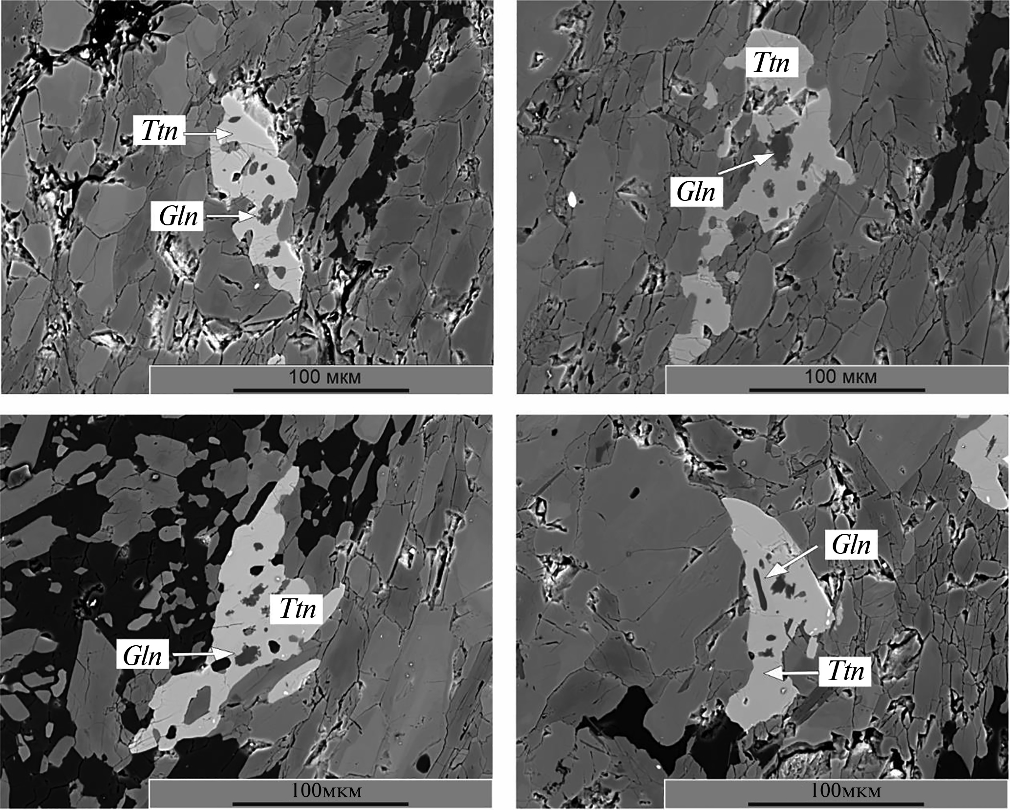 Типичной минеральной ассоциацией базитовых тектонитов является Grt + Amp + Pl + Ep + Chl + + Ph + Qz + Spn + Rt + Ilm ± Cb. По микротекстурам и соотношениям между минералами метабазитов выделяется две стадии развития. Кульминационная ассоциация представлена интенсивно деформированными минералами бластомилонитов (рис. 3а, 3в). Ядра граната часто содержат мелкие реликтовые включения глаукофана, альбита, фенгита, эпидота и хлорита, что свидетельствует об участии последних в ранней допиковой ассоциации (рис. 3б). Глаукофан также был обнаружен в зернах титанита (рис. 4). Обнаружение минералов глаукофансланцевого парагенезиса в тектонитах ПРСЗ свидетельствует о проявлении субдукции на западе Сибирского кратона.