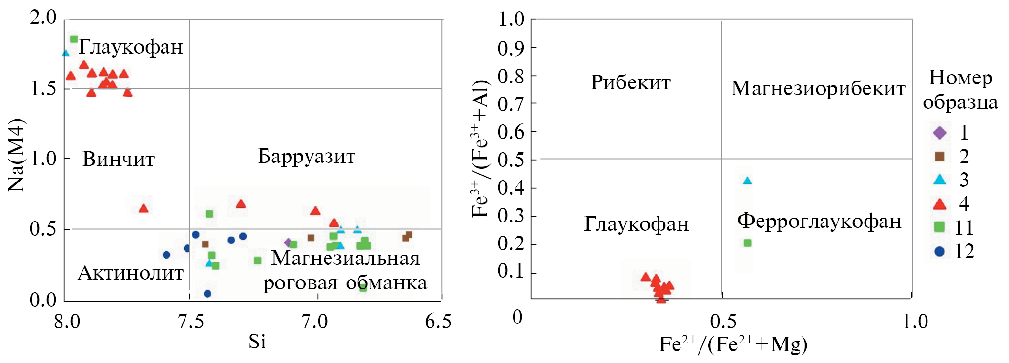 Северо-Енисейский блок. Компонентный состав гранатов в метабазитах пиковой ассоциации изменяется в диапазоне: Alm55–66, Prp5–11, Grs22–32, Sps5–9, с XFe = 0.84–0.92 (табл. 1; Likhanov et al., 2018). Амфиболы представлены роговой обманкой и актинолитом с высокой железистостью (XFe = 0.34–0.53), реже барруазитом с повышенным содержанием Na2O (до 2.8 мас. %) (табл. 2; рис. 5). Плагиоклаз относится к альбит-олигоклазу с XAn = Ca/(Ca+Na+K) = 0.04–0.17. Белая слюда представлена фенгитом с высоким содержанием селадонитового (3.4–3.5 Si в форм. ед.) компонента и (FeO + + MgO) до 5.5 мас. % при незначительных изменениях парагонитовой составляющей (XNa = 0.03–0.08) (табл. 1; Likhanov et al., 2018). Железистость хлорита варьирует от 0.34 до 0.49. Карбонаты представлены кальцитом с содержанием FeO до 2.8 мас. % и MgO до 1.6 мас. % и железистым (FeO до 10 мас. %) доломитом. Составы акцессорных эпидота, титанита, ильменита и рутила близки к стехиометрическим формулам (Likhanov et al., 2018).