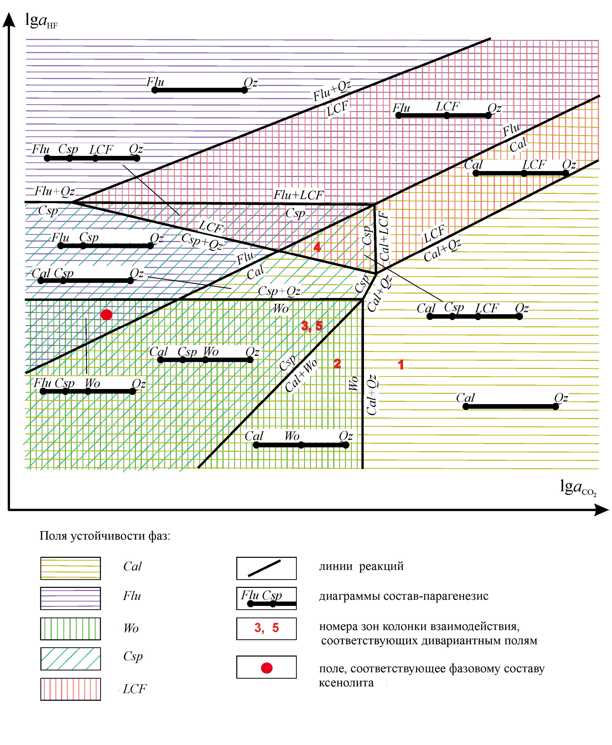 Дивариантные поля устойчивости перечисленных фаз определяют пределы изменений активности CO2 и HF, в которых формируются соответствующие зоны. Моновариантные линии отражают условия протекания реакций на границах зон. Бинарные диаграммы состав–парагенезис показывают, какие пары минералов могут образоваться в этой зоне в зависимости от количественного соотношения кальция и кремния. Например, при высокой активности СО2 и низкой HF на всем диапазоне составов системы устойчивым является равновесие кварца с кальцитом (рис. 6, дивариантное поле 1). При понижении активности СО2 эти два минерала взаимодействуют с образованием волластонита (моновариантная линия Cal + Qz → Wo). Реакция идет вплоть до исчерпания одной из фаз. Если система имела существенно кальциевый состав, то слева от линии реакции (рис. 6, дивариантное поле 2) устойчивым парагенезисом будет Сal + Wo. Если в составе системы преобладает кремний, то Qtz + Wo. Равновесие же Qtz + Cal для поля 2 является запрещенным и при таких значениях aHF и aCO2 не может быть реализовано.