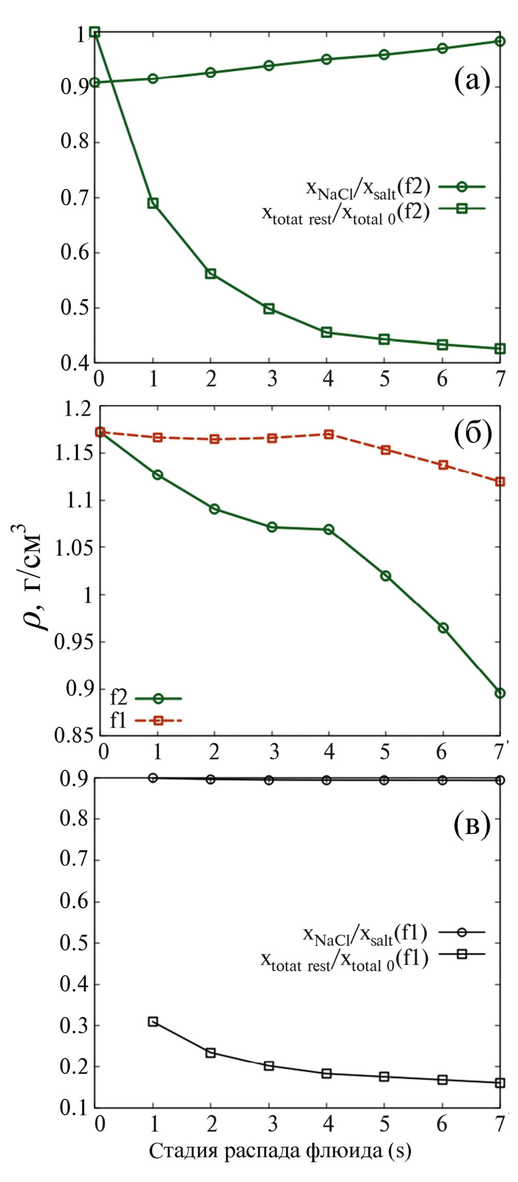 В случае флюида B высокая мольная доля NaCl в испытывающем расслоение флюиде ведет к значительному содержанию NaCl в фазе f1 – rNaCl ≈ 0.90. На каждой стадии гетерогенизации от преобладающей фазы f2 отделяется значительное количество фазы f1. В результате после прохождения всех стадий гетерогенизации фаза f2 теряет более 50% исходного вещества (рис. 5а). Доля NaCl при этом возрастает с rNaCl = 0.91 до rNaCl = 0.98, т. е. почти чистой соли NaCl. В обоих рассмотренных в данном разделе примерах плотность фазы f2 значительно превышает плотность фазы f1, что в случае флюидных потоков соответствующего состава благоприятствует пространственному разделению этих фаз.