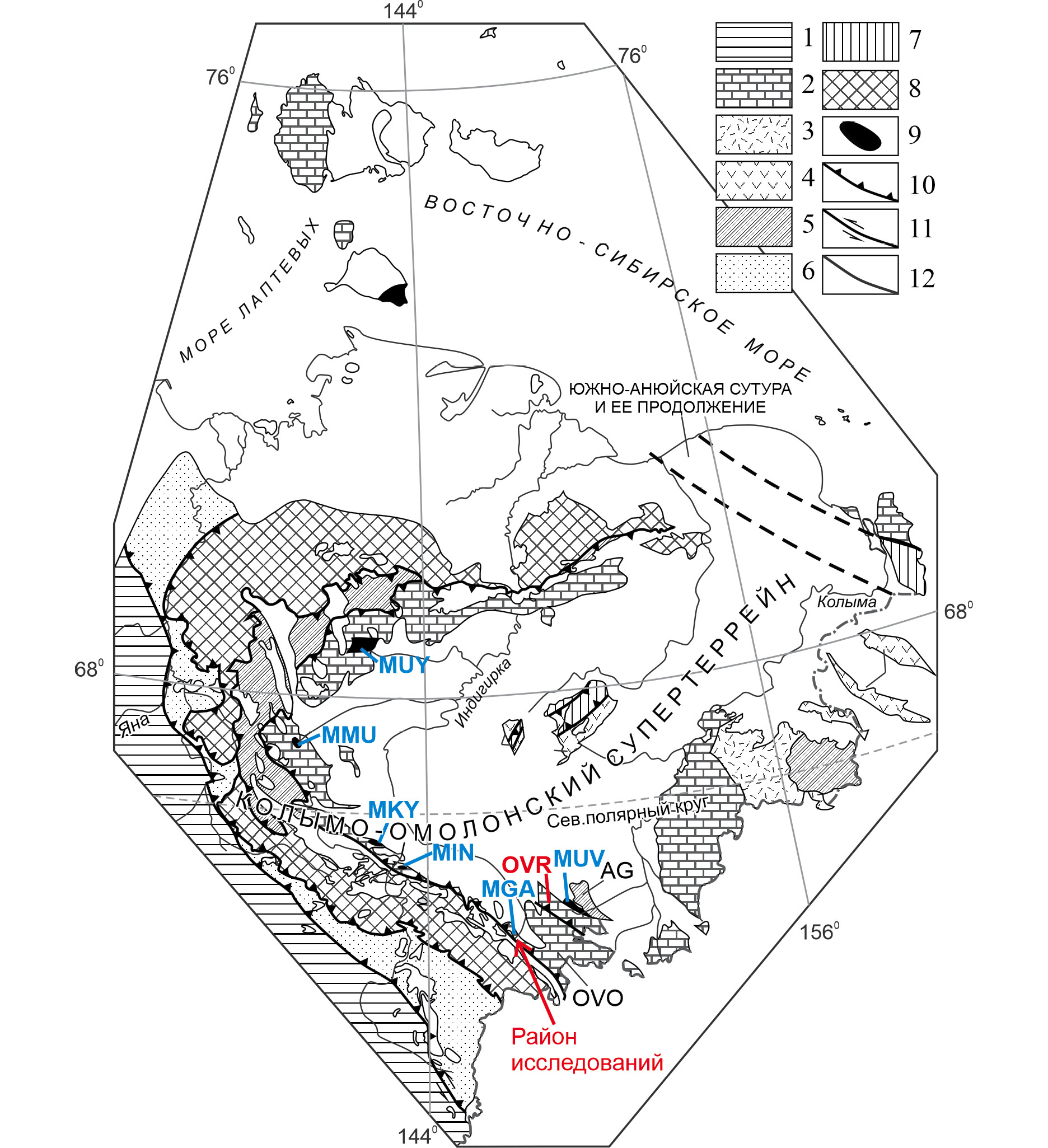 Рис. 1. Положение массивов офиолитов хр. Черского и района исследований на схеме тектонического районирования Верхояно-Колымской складчатой области (Парфенов и др., 2001), с изменениями по (Соколов и др., 2010) и упрощениями. 1 – Верхоянский складчато-надвиговый пояс; террейны: 2 – пассивной континентальной окраины; 3 – кратонный (Омолонский); 4 – островодужные; 5 – турбидитовые; 6 – турбидитовый подножия континентальной окраины (сланцевый пояс); 7 – аккреционного клина, сложенные преимущественно океаническими отложения; 8 – аккреционного клина, преимущественно турбидитовый (Полоусно-Дебинский); 9 – массивы офиолитов, в том числе Мунилканского террейна: MUY – Уяндинский (Калгынский), MMU – Мунилканский, MKY – Кабытыгасский, MIN – Индигирский (Уччинский), MGA – Гарбыньинский, MUV – Увязкинский; 10 – надвиги; 11 – сдвиги; 12 – разломы. OVR – Рассохинский и граничащие с ним Омулевский (OVO) и Арга-Тасский (AG) террейны.