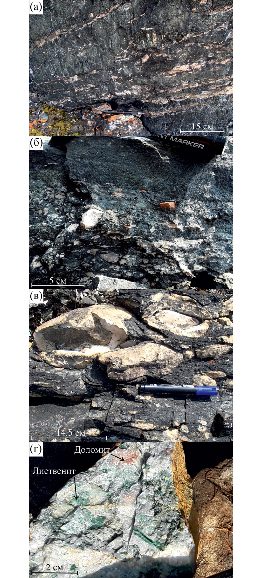 Рис. 2. Породы офиолитокластитовой толщи из бассейна р. Рассоха: (а) переслаивание прослоев и линз доломитовых пород (светло-бежевые) с серпентинитовыми алевролитами (темные зеленовато-серые); (б) серовато-зеленые серпентинитовые песчаники и гравелиты со щебенкой и мелкой галькой разноокрашенных доломитовых пород; (в) прослой валунно-галечных конгломератов в серпентинитовом песчанике, гальки и валуны сложены доломитовыми породами; (г) лиственитовый песчаник с розоватой галькой доломитовых пород.