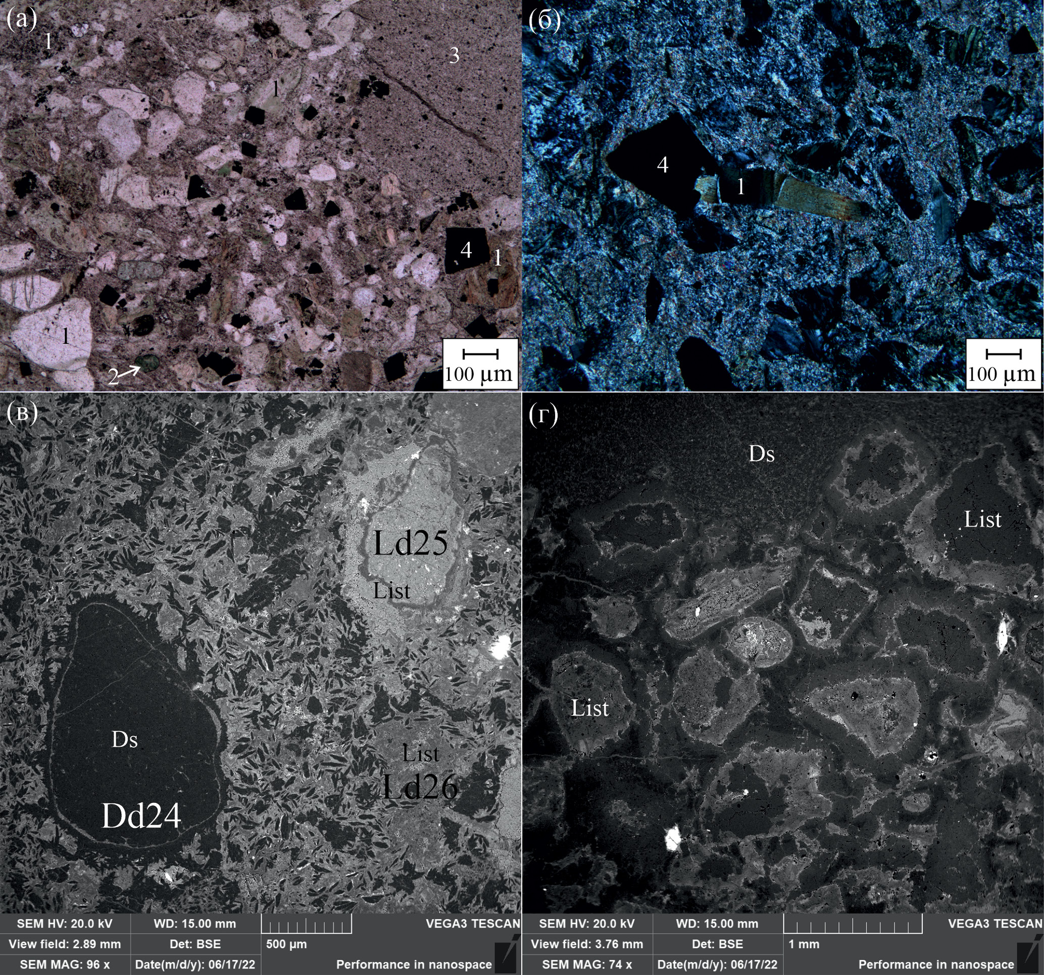 Рис. 3. Серпентинитовый песчаник (обр. 1099/4) (а, б) и лиственитовый песчаник (обр. 1099/1) (в, г). (а) – в проходящем свете; (б) – в поляризованном свете; (в, г) – во вторичнорассеянных электронах (BSE). Обломки на (а, б): 1 – серпентинитов, 2 – хлорититов, 3 – доломитовых пород, 4 – хромшпинелиды и магнетиты. Обломки на (в, г) и других рисунках: Ds – доломитовых пород, List – лиственитов. Проанализированные литокласты (здесь и на других рисунках) пронумерованы (см. Suppl. 2, ESM_1.xls).