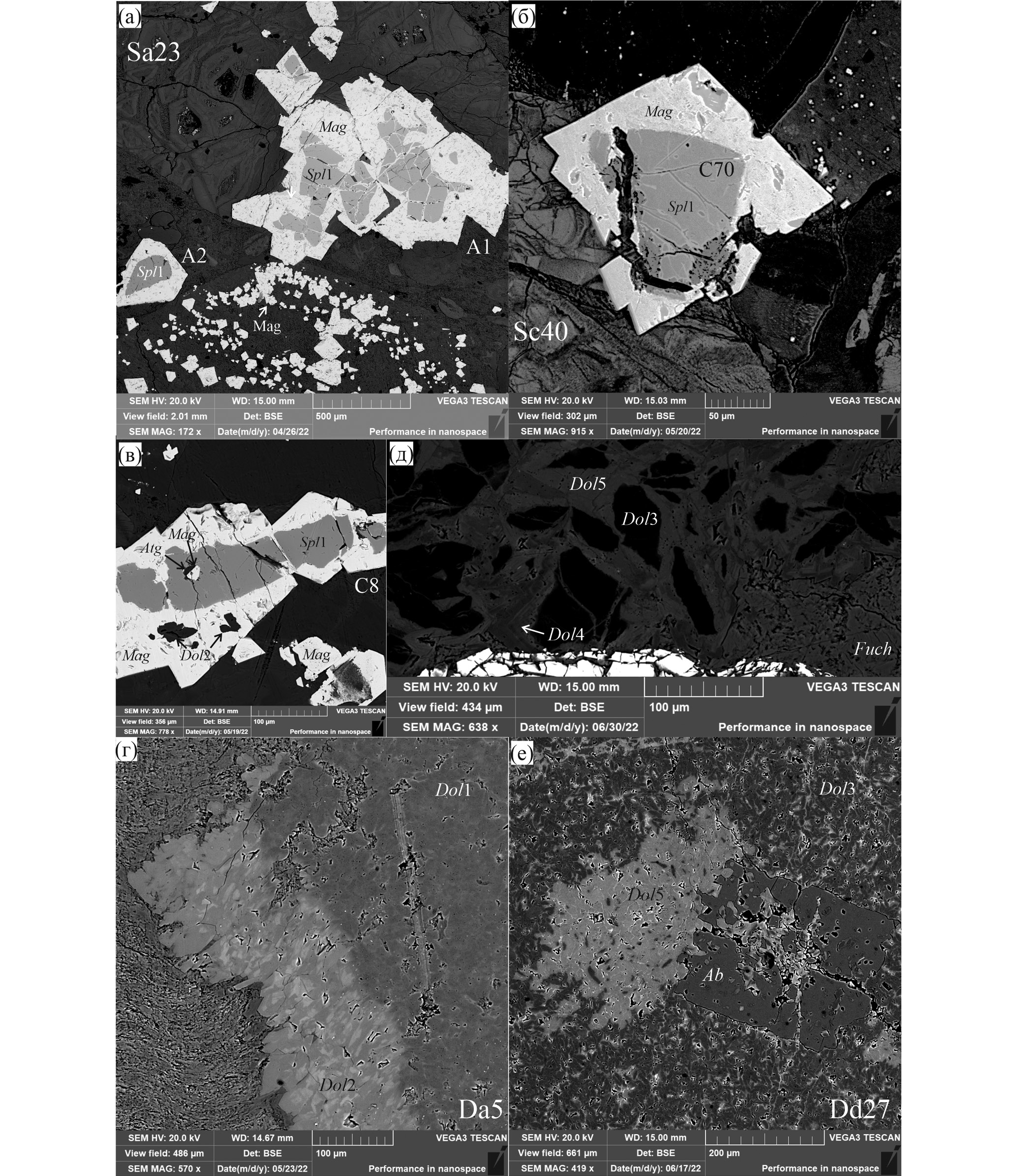 Рис. 4. Постседиментационная перекристаллизация в песчаниках. BSE изображения: (а–в) развитие идиоморфного магнетита в обломках и в матриксе серпентинитовых песчаников; (г) кайма ферродоломита на контакте обломка доломитовой породы с матриксом серпентинитового песчаника; (д) ферродоломит, цементирующий мелкие обломки доломитовых пород в лиственитовом песчанике; (е) перекристаллизация доломита на отдельных участках и на контакте с альбитом, обломок доломитовой породы в лиственитовом песчанике. Аббревиатура минералов здесь и далее по (Warr, 2021), генерации минералов (здесь и на других рисунках) охарактеризованы в тексте. Проанализированные зерна хромшпинелидов (здесь и на других рисунках) пронумерованы (см. Suppl. 2, ESM_2.xls).