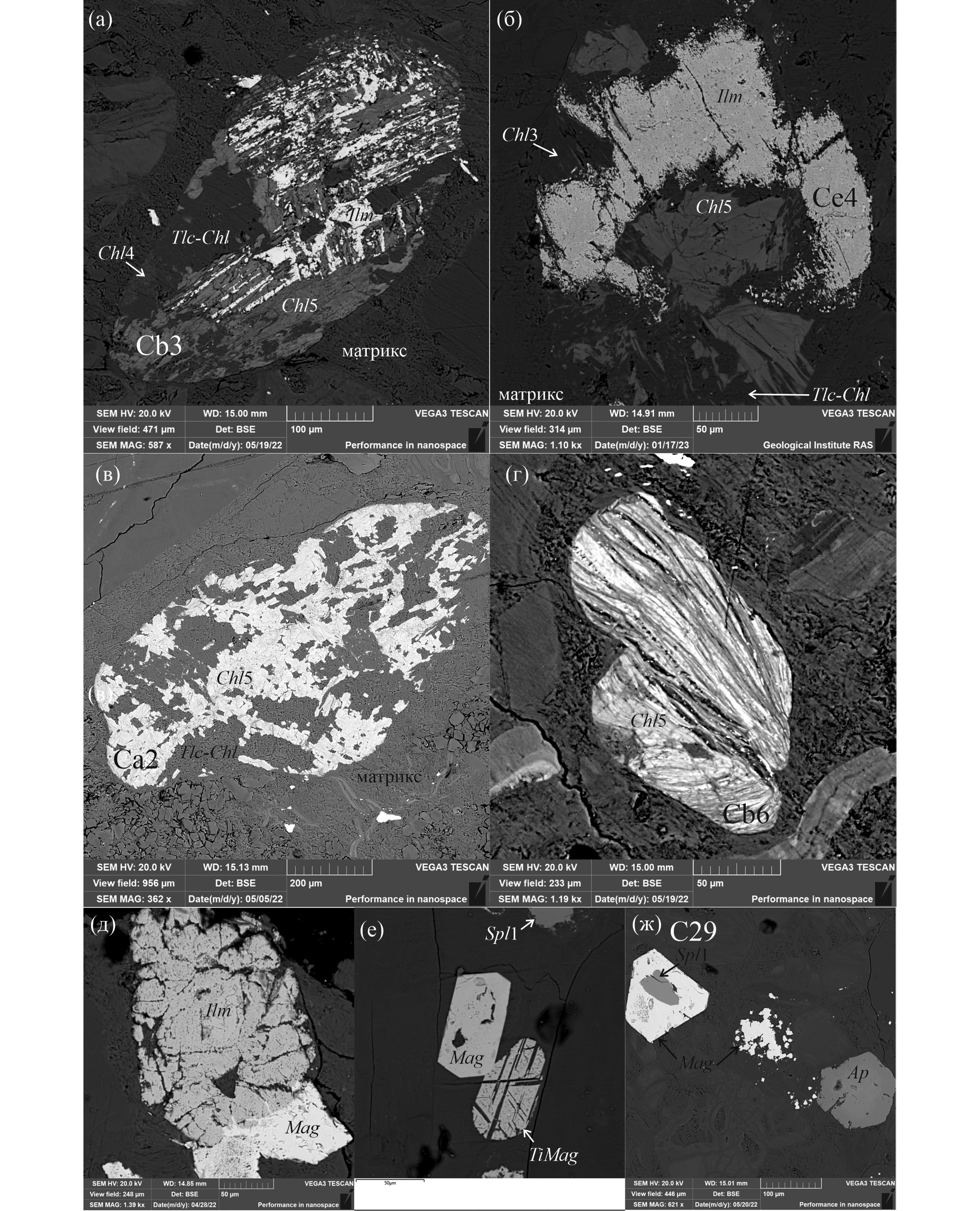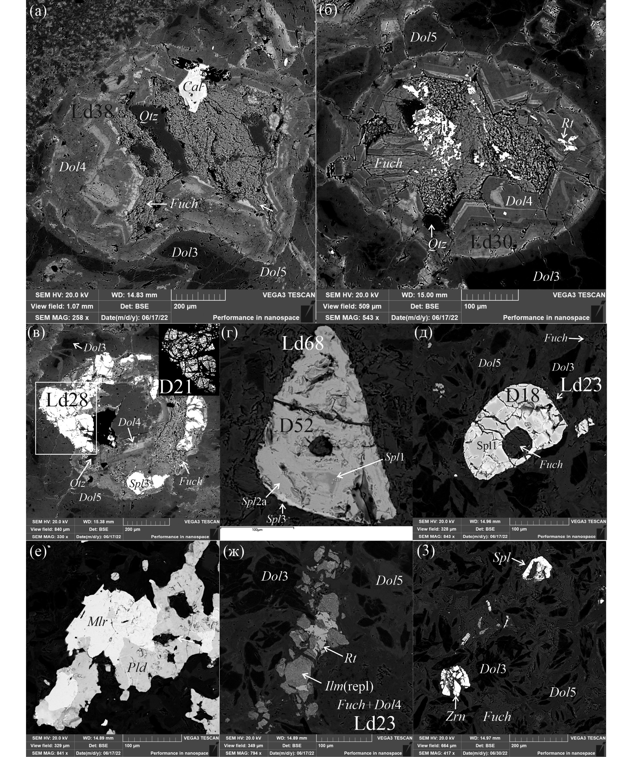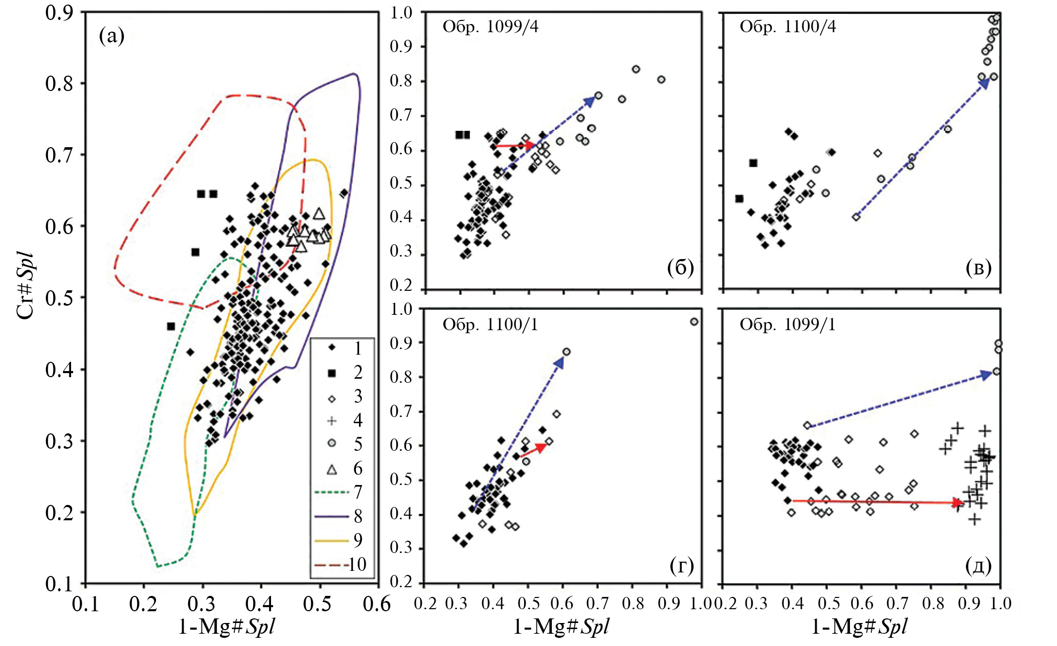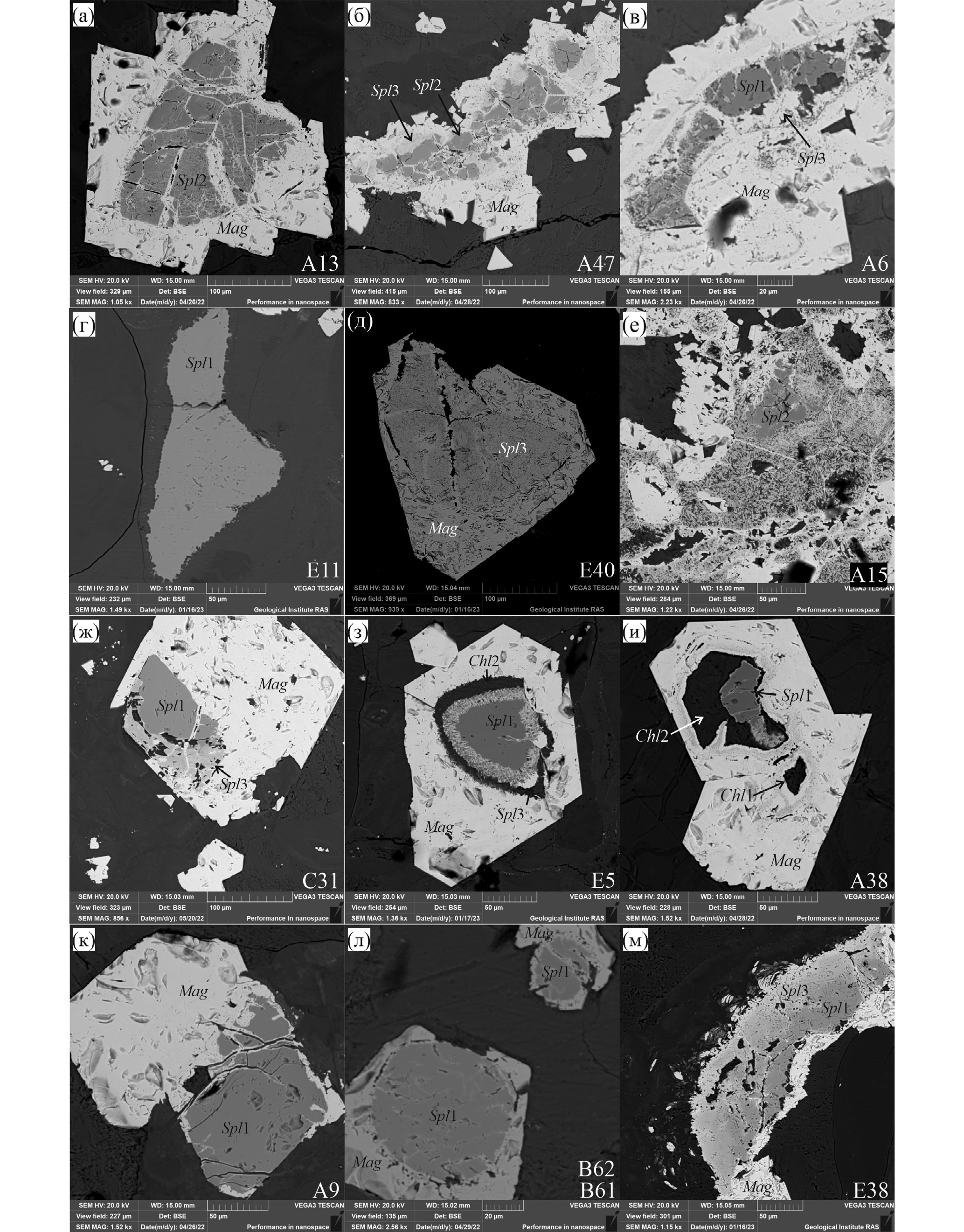 Примечание. Cr#Spl = Cr/(Cr+Al), Mg#Spl = Mg/(Mg + Fe2+), F#Spl = Fe3+/(Cr + Al + Fe3+). Генерации минералов охарактеризованы в тексте и подрисуночных подписях.
