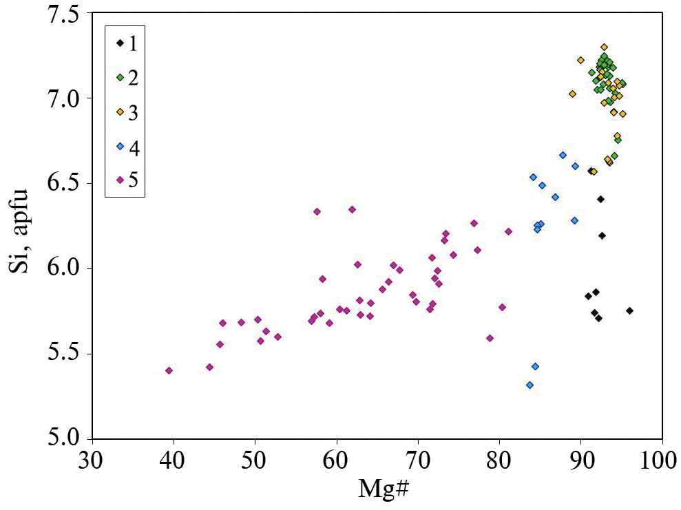 Исследования ультрамафит–мафитовых массивов, объединяемых в офиолитовый пояс хр. Черского (Верхояно-Колымская складчатая область), были направлены на выявление их структурной позиции и геологического строения, а также на определение геодинамической обстановки, времени формирования и метаморфической истории входящих в их состав пород (Лейер и др., 1993; Oxman et al., 1995; Оксман, 2000; Карякин и др., 2002; Ганелин и др., 2022). При этом ультрамафиты остаются наименее изученными породами, что обусловлено их интенсивной метаморфической переработкой и редкой сохранностью первичных минералов. В литературе приводятся лишь краткие петрографические описания серпентинизированных мантийных перидотитов, дунитов, верлитов, пироксенитов и немногочисленные данные о составах их первичных минералов (Оксман, 2000). Таким образом, предположения о геодинамической обстановке формирования офиолитов хр. Черского в этих работах, основанные на результатах изучения геохимии вулканитов, габброидов и амфиболитов, не подкреплены результатами изучения ультрамафитов.