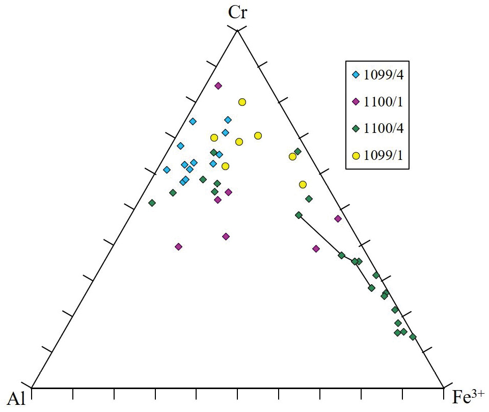 Детально были исследованы четыре образца песчаников, положение точек опробования которых показано на рис. 1S (см. Supplementary 1). Петрография пород изучалась в прозрачно-полированных шлифах на оптическом микроскопе в проходящем и отраженном свете, а также во вторично-рассеянных электронах на сканирующем электронном микроскопе (СЭМ) TESCAN Vega3, оснащенном полупроводниковым детектором рентгеновского излучения ULTIM MAX 40 (Oxford Instruments), в Геологическом институте РАН (г. Москва). Исследование шлифов на СЭМ сопровождалось массовыми определениями составов минералов. Микроанализы проводились в точке при ускоряющем напряжении 20 кВ с накоплением 1 млн импульсов. Обработка спектров выполнена в программе AZtec. Хотя данная методика позволяет достаточно надежно определять составы первичных и метаморфических шпинелидов (Mellini et al., 2005) и филлосиликатов (Nakatani, Nakamura, 2016), мы сопоставили результаты измерения составов силикатов и шпинелидов на микрозонде Cameca-SX100 в Институте геохимии и аналитической химии им. В.И. Вернадского РАН (г. Москва) и на микрозонде Jeol JXA8200 SuperProbe в Институте химии им. Макса Планка (г. Майнц, Германия), полученные с использованием международных стандартов, с результатами энергодисперсионного анализа. Несмотря на то, что аналитическая погрешность определения содержаний элементов и пределы обнаружения при энергодисперсионном анализе несколько выше, систематическая разница оказалось незначительной и была минимизирована эмпирической калибровкой. Представительные составы шпинелидов приведены в табл. 1, средние составы филлосиликатов и карбонатов – в табл. 2, а все проанализированные составы минералов – в Supplementary 2.