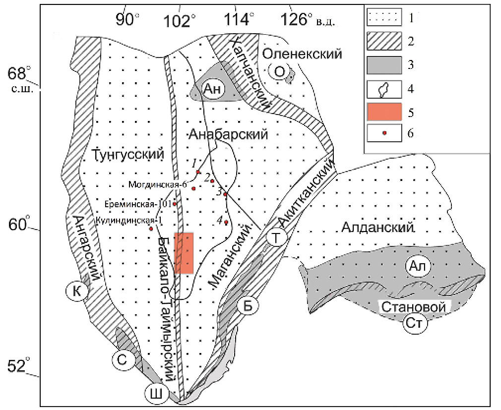 Рис. 1. Тектоническая схема строения фундамента Сибирской платформы, по (Donskaya, 2020) с изменениями. 1 – супертерейны; 2 – палеопротерозойские орогенные пояса; 3 – выступы фундамента (цифры в кружках): Ал – Алданский, Ст – Становой, О – Оленекский, Ан – Анабарский, К – Канский, С – Саянский, Ш – Шарыжалгайский, Б – Байкальский, Т – Тонодский; 4 – границы Непско-Ботуобинской антеклизы (НБА); 5 – район расположения изученных скважин (контур рис. 2); 6 – положение скважин в Тунгусском супертеррейне и Маганском террейне: 1 – Унга-Хасынская-2980, 2 – Мегеляхская-2441, 3 – Сюльдюкарская-10-1, 4 – Среднеботуобинская-1, по (Ларичев и др., 2022). Расположение скважин Кулиндинская-1 и Ереминская-101 по (Самсонов и др., 2022), скв. Могдинская-6 по (Попов и др., 2015).