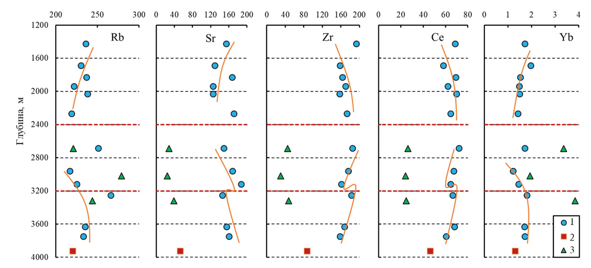 Рис. 2. Разрез гранитов Эльджуртинского массива по результатам изучения Тырныаузской глубокой скважины с отмеченными местами отбора изученных образцов. Составлено по (Докучаев, Носова, 1994).