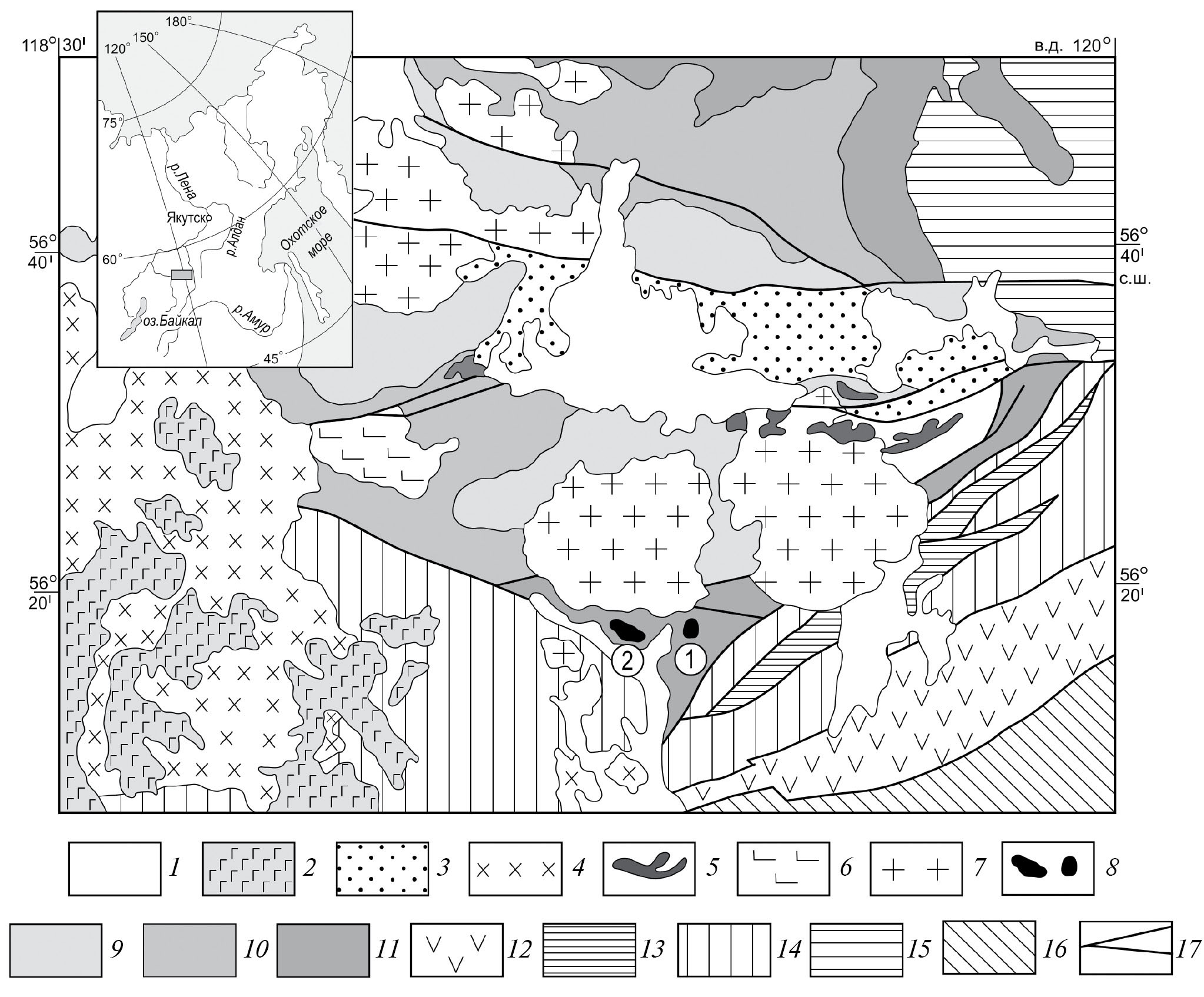 1 – четвертичные отложения; 2 – платобазальты (N2–Q); 3 – вендские, кембрийские, ордовикские и юрские отложения нерасчлененные; 4 – граниты, гранодиориты, граносиениты и монцониты ингамакитского комплекса (PZ); 5 – габбро и долериты доросского комплекса (PR1); 6 – расслоенные интрузии чинейского комплекса (PR1); 7 – гранитоидные интрузии кодарского комплекса (PR1); 8 – интрузии редкометальных гранитов (1 – Катугинский, 2 – Западно-Катугинский массивы) катугинского комплекса (PR1); 9–11 – терригенные отложения удоканского комплекса (PR1): 9 – кеменская серия, 10 – чинейская серия, 11 – кодарская серия; 12 – неоархейские анортозиты каларского комплекса; 13 – слабометаморфизованные толщи субганского комплекса; 14 – гранат-биотитовые гнейсы и кристаллические сланцы каларской толщи (PR1?); 15 – мезоархейские тоналит-трондьемитовые ортогнейсы олекминского комплекса; 16 – метаморфические и магматические комплексы Селенгино-Станового супертеррейна Центрально-Азиатского складчатого пояса; 17 – главные разрывные нарушения.