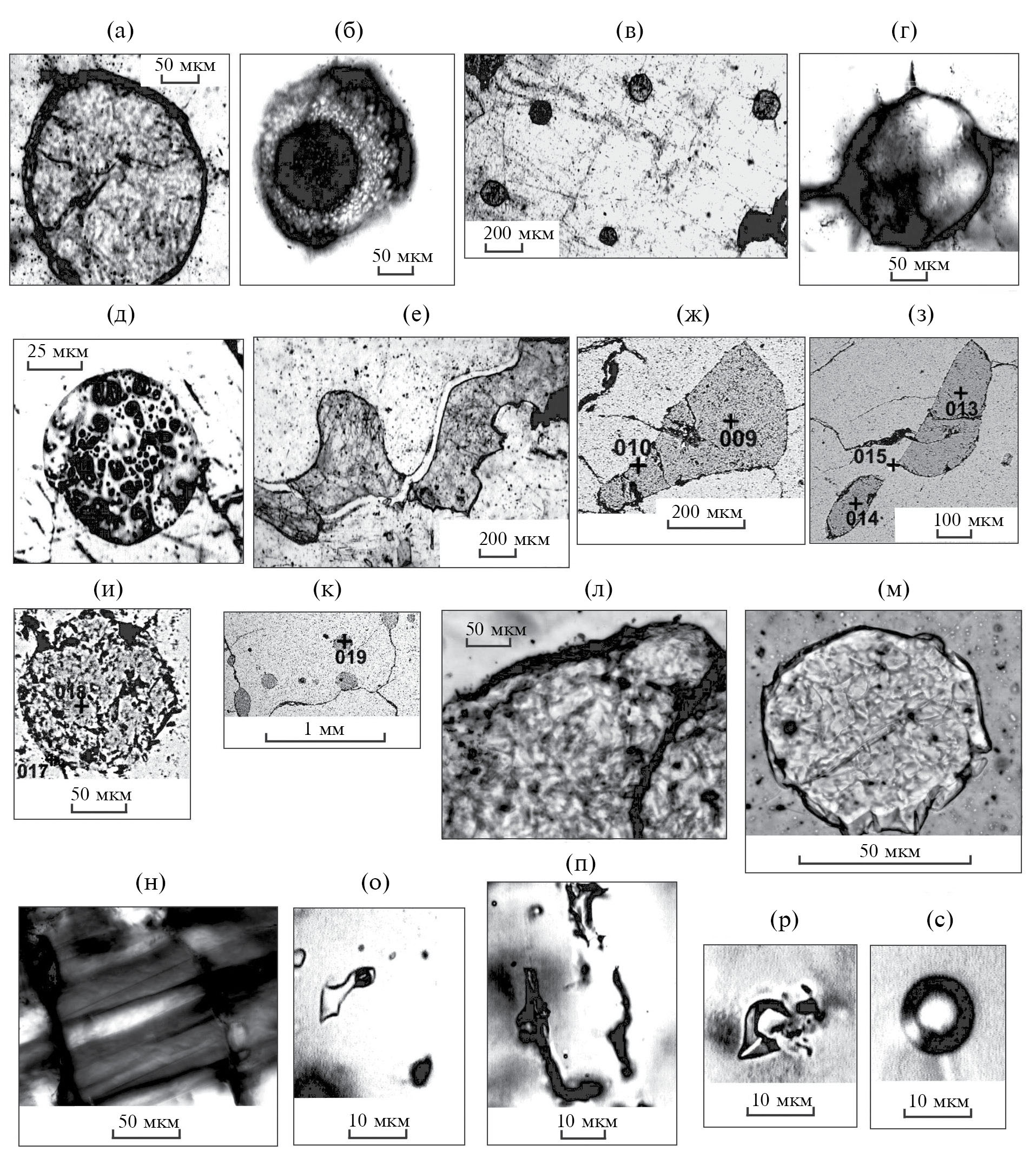 Рис. 2. Микрофотографии выделений криолита (а–н) и флюидных включений в нем (о–с). (а) – глобула криолита с зоной закалки; (б) – глобула криолита с газовым пузырьком; (в) –глобулы криолита с зонами закалки в калиевом полевом шпате (структура “снежного кома”); (г) – глобула криолита, декрепитированная вследствие наложенного термального (метаморфизма) события; (д) – крупные обособления флюидной фазы в глобуле криолита после гомогенизации ее и последующего охлаждения; (е) – деформация – прожилка криолита в граните при метаморфизме; (ж, з, и, к) – проанализированные глобулы криолита с точками измерений в режиме отраженных электронов (результаты приведены в табл. 1); (л–м) – каемки идиоморфного β-криолита на поверхности глобул криолита; (н) – α-криолит с полисинтетическими двойниками; (о, с) – первичные флюидные включения в криолите (с температурой гомогенизации 250–400◦С); (п, р) – вторичные декрепитированные флюидные включения в криолите крупной линзы.