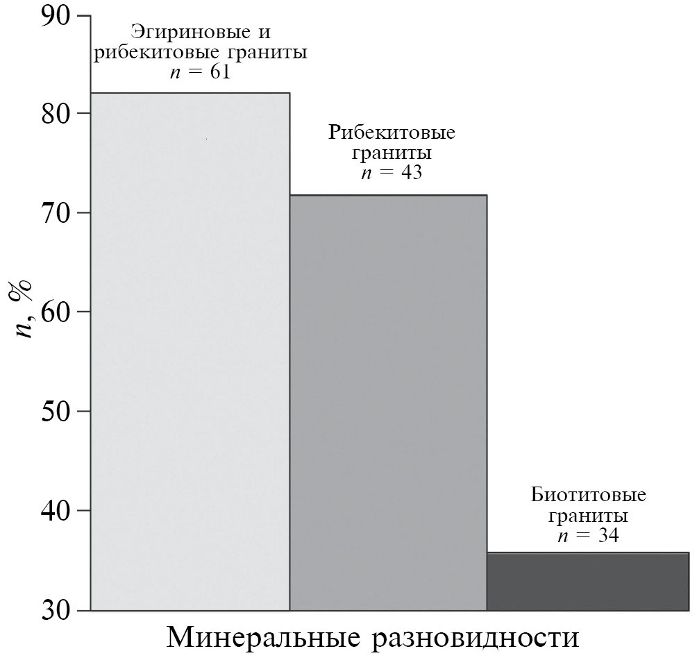 Рис. 3. Относительное количество криолита в гранитах разного минерального состава в гранитах катугинского комплекса. Использованы результаты исследования 138 петрографических шлифов.