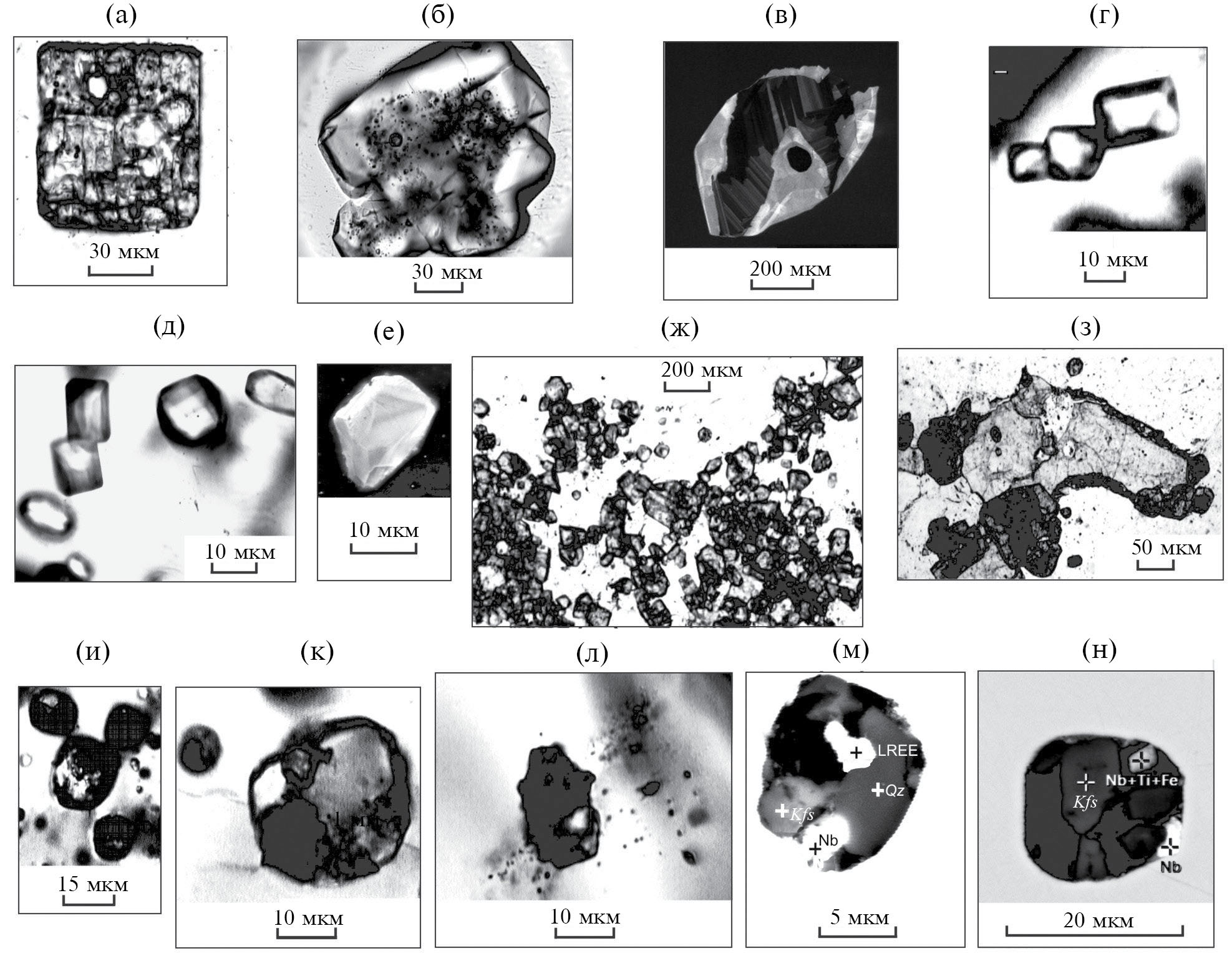 (а) – идиоморфный сиреневый кристалл циркона (первая генерация); (б) – зональное зерно циркона (ядро – магматический циркон первой генерации, оболочка – метаморфический циркон второй генерации); (в) – зерно циркона сложного строения в режиме катодолюминесценции (магматическое ядро с осцилляторной зональностью и однородная серая оболочка метаморфического циркона второй генерации); (г–д) – идиоморфные кристаллы циркона (третья генерация); (е) – кристалл циркона (третья генерация) в режиме катодолюминесценции; (ж) – шлировидное скопление кристаллов циркона в эгиринсодержащем граните; (з) – каймы из кристаллов циркона на поверхности глобул криолита; (и–н) – расплавные включения в цирконе первой генерации: (и, к) – полностью раскристаллизованные ненарушенные расплавные включения в зернах циркона из шлировидного скопления; (л) – декрепитированное расплавное включение; (м, н) – точки измерения состава минералов в полностью раскристаллизованных ненарушенных расплавных включениях в режиме отраженных электронов (Qz – кварц, Kfs – калиевый полевой шпат, Nb-, LREE-, (Nb + Ti + Fe) – минеральные фазы с высоким содержанием Nb, легких редкоземельных элементов, Nb, Ti и Fe соответственно, диагносцированные с помощью электронного микроскопа JEOLJSM-651OLA).
