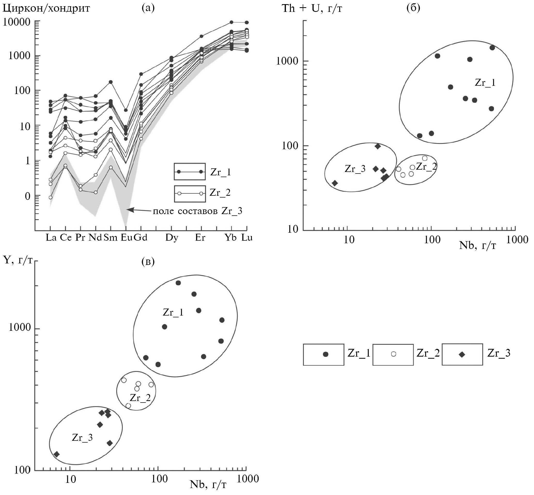 Рис. 5. Диаграммы, отражающие различия в составе разных генераций циркона из гранитов Катугинского массива. (а) – распределение редкоземельных элементов в цирконе разных генераций гранитов Катугинского массива. Данные нормированы по (Taylor, McLennan, 1985). (б) – диаграмма Nb–(Th + U) с фигуративными точками состава циркона разных генераций. (в) – диаграмма Nb–Y с фигуративными точками состава циркона разных генераций. Диаграммы построены по данным табл. 3. Zr_1, Zr_2, Zr_3 – циркон первой, второй и третьей генераций соответственно.