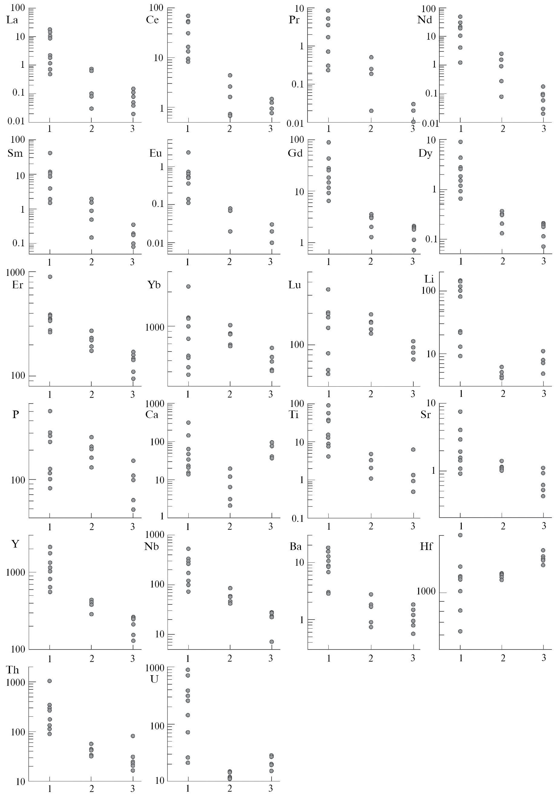 Циркон рассмотренных генераций различается не только морфологией, возрастом, катодолюминесцентными и флюидными характеристиками, но и содержанием микроэлементов. Первые данные о микроэлементном составе циркона из гранитов Катугинского массива опубликованы в работе (Левашова и др., 2014). Частично эти данные использованы и в настоящей работе (табл. 3). Использование остальных опубликованных данных затруднительно в связи со сложностями установления их соответствия выделенным нами генерациям циркона. Наиболее значимые различия состава циркона разных генераций приведены на рис. 5а и в табл. 3. При переходе от первой к третьей генерации циркона наблюдается закономерное уменьшение содержаний редкоземельных элементов за исключением Yb и Lu, а также Y, Nb, Ti и Th (рис. 6). Кроме того, магматический циркон отличается от метаморфического циркона второй и третьей генераций повышенными содержаниями Li, Sr, Ba и U. Также следует отметить, что циркон (в первую очередь циркон первой генерации) является одним из значимых концентраторов таких рудных компонентов как Nb, Y, Th и U (рис. 6).