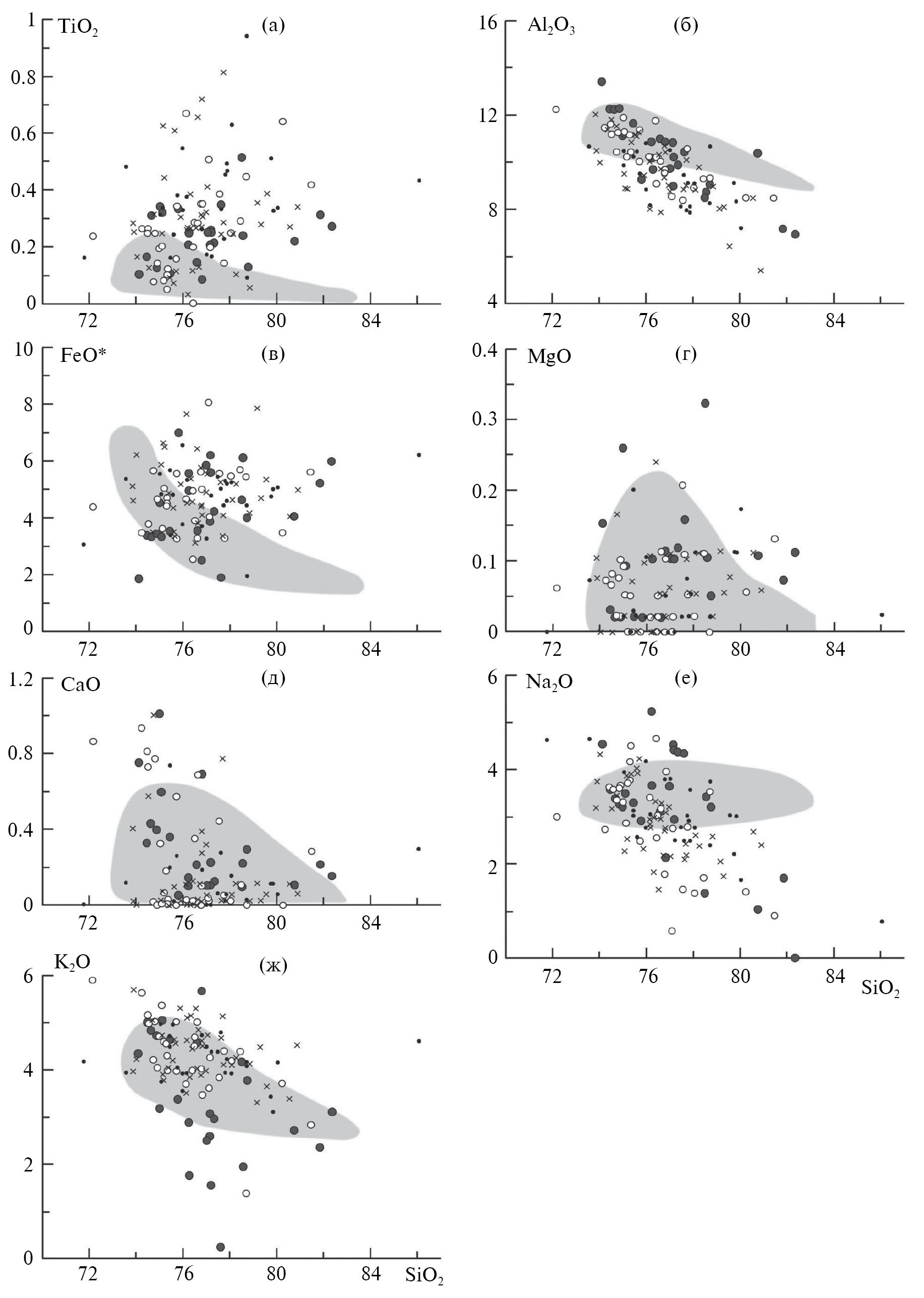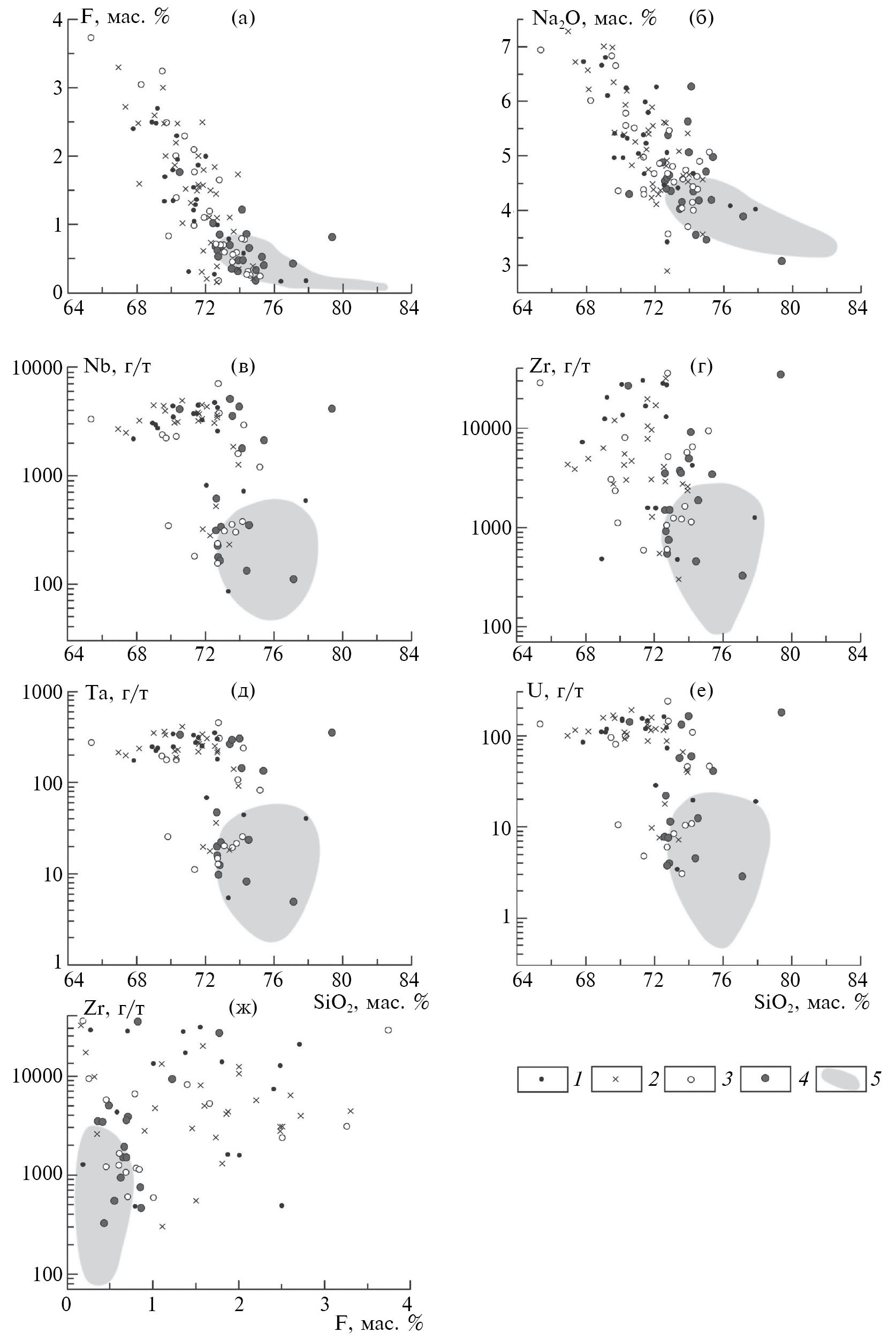 Рис. 7. Вариации ряда химических элементов в гранитах Катугинского комплекса в зависимости от содержаний SiO2 (а–е) и F (ж).