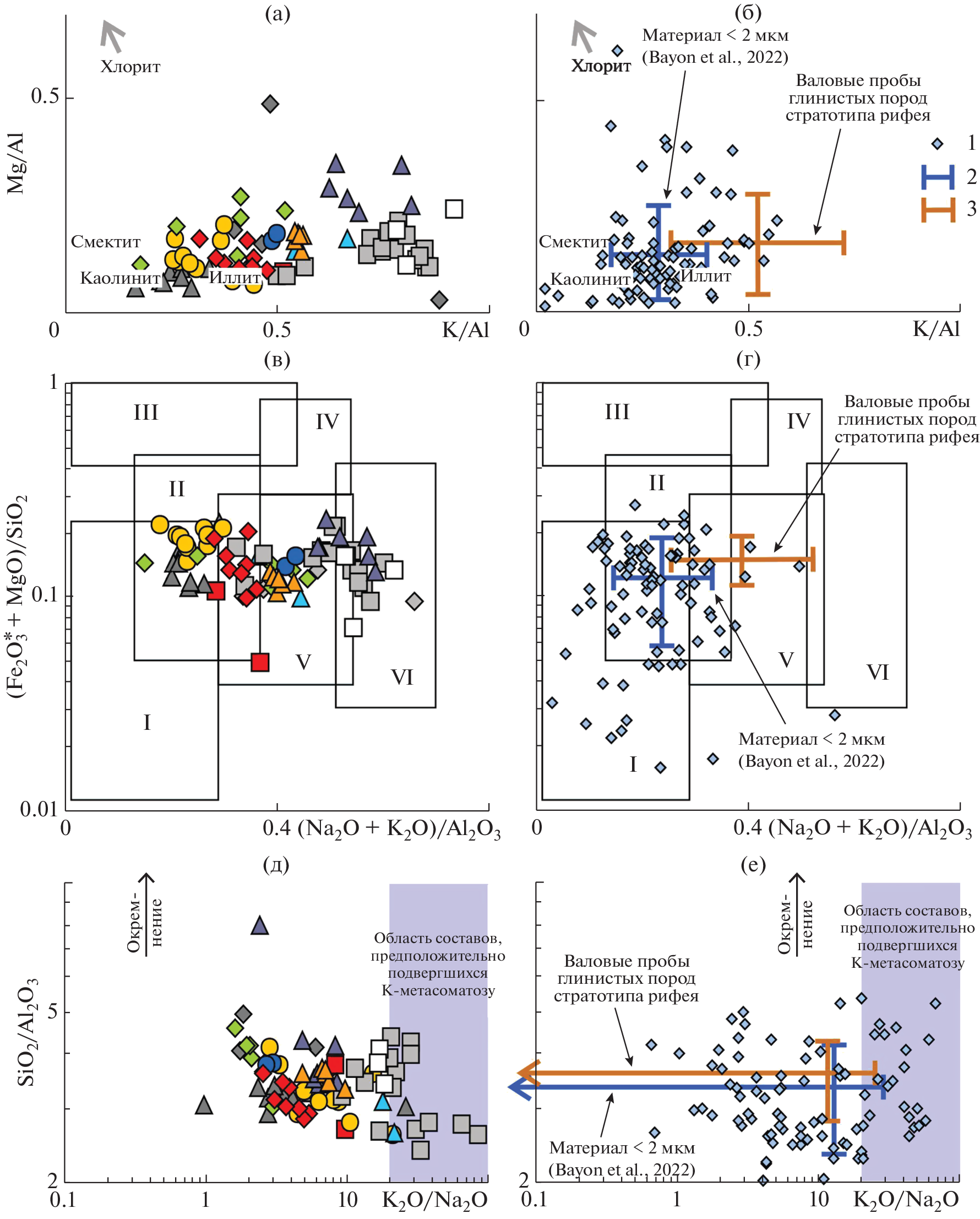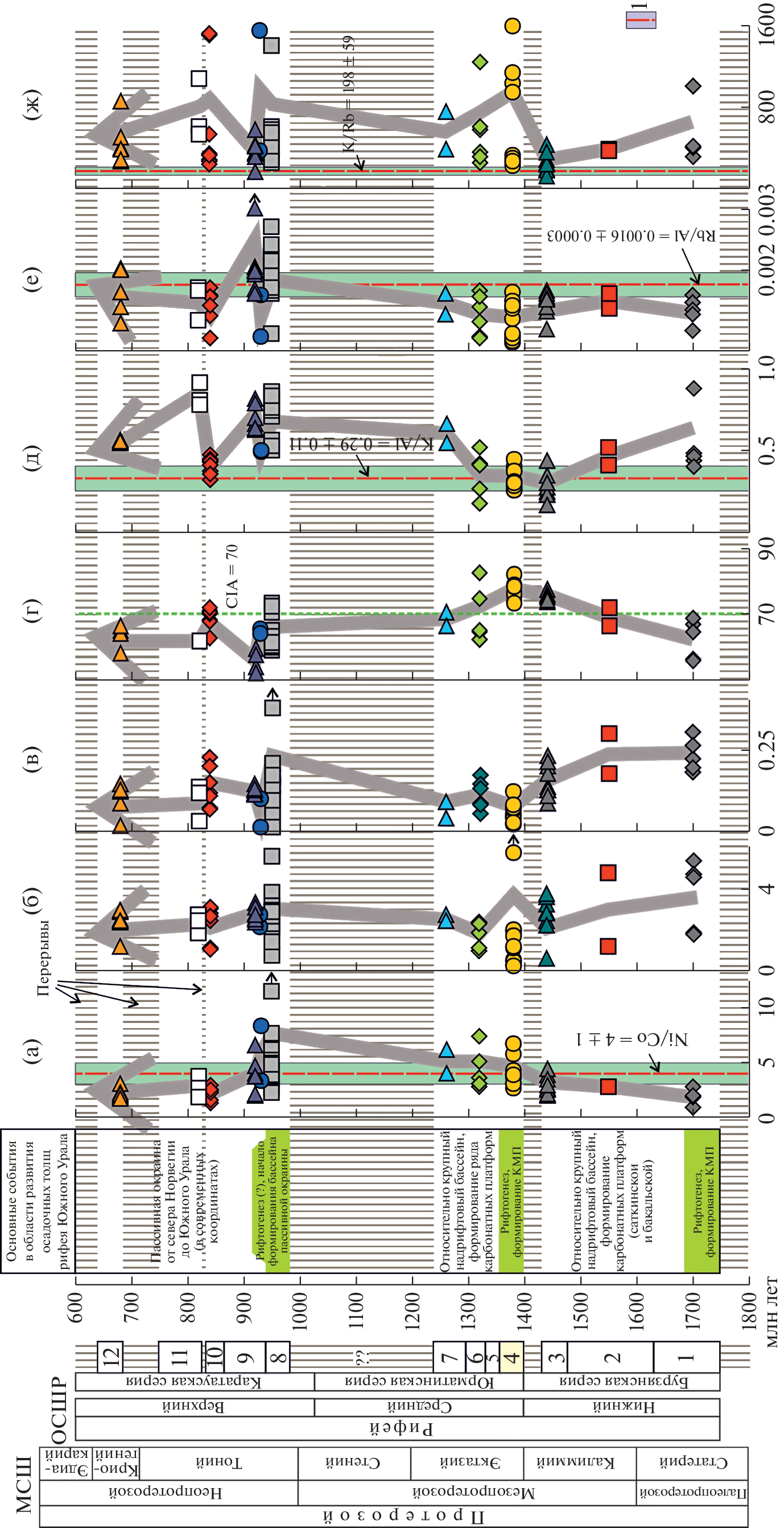 The values of Ni/Co, La/Sc, and Th/Cr (indicators of the composition of rock complexes eroded in paleowatersheds) and the values of CIA, Rb/Al, K/Al and K/Rb (indicators of the intensity of chemical weathering on land), typical for fine-grained clastic rocks of the Riphean of the Southern Urals were compared to the data given in the publication “Long-term evolution of terrestrial weathering and its link to Earth’s oxygenation” by Bayon G., Bindeman I.N., Trinquier A., Retallack G.J., and Bekker A. (Earth Planet. Sci. Lett., 2022, v. 584. 117490). It was shown that the average Rb/Al ratio (0.0014 ± 0.0006, n = 66) typical of the Riphean clayey rocks of the Southern Urals, together with other data, suggests that for more than 1.10 Ga (from ~1.75 to ~0.60 Ga) the intensity of chemical weathering in paleowatersheds was relatively low. This is in good agreement with the data obtained by Bayon et al. The material presented in the article allows us to consider that the composite “world” curves of K/Al, Rb/Al, and K/Rb by Bayon et al. and the same curves for clayey rocks of the Riphean of the Southern Urals are sufficiently comparable. Thus, data on the lithogeochemical characteristics of fine-grained clastic/clayey rocks of the Riphean stratotype significantly expand our understanding of the nature of chemical weathering processes on land in the interval 1.75–0.60 Ga ago.