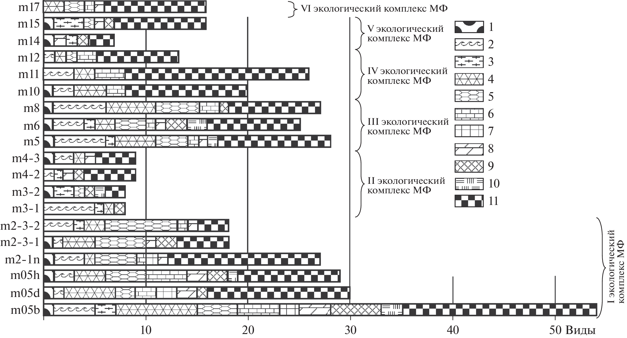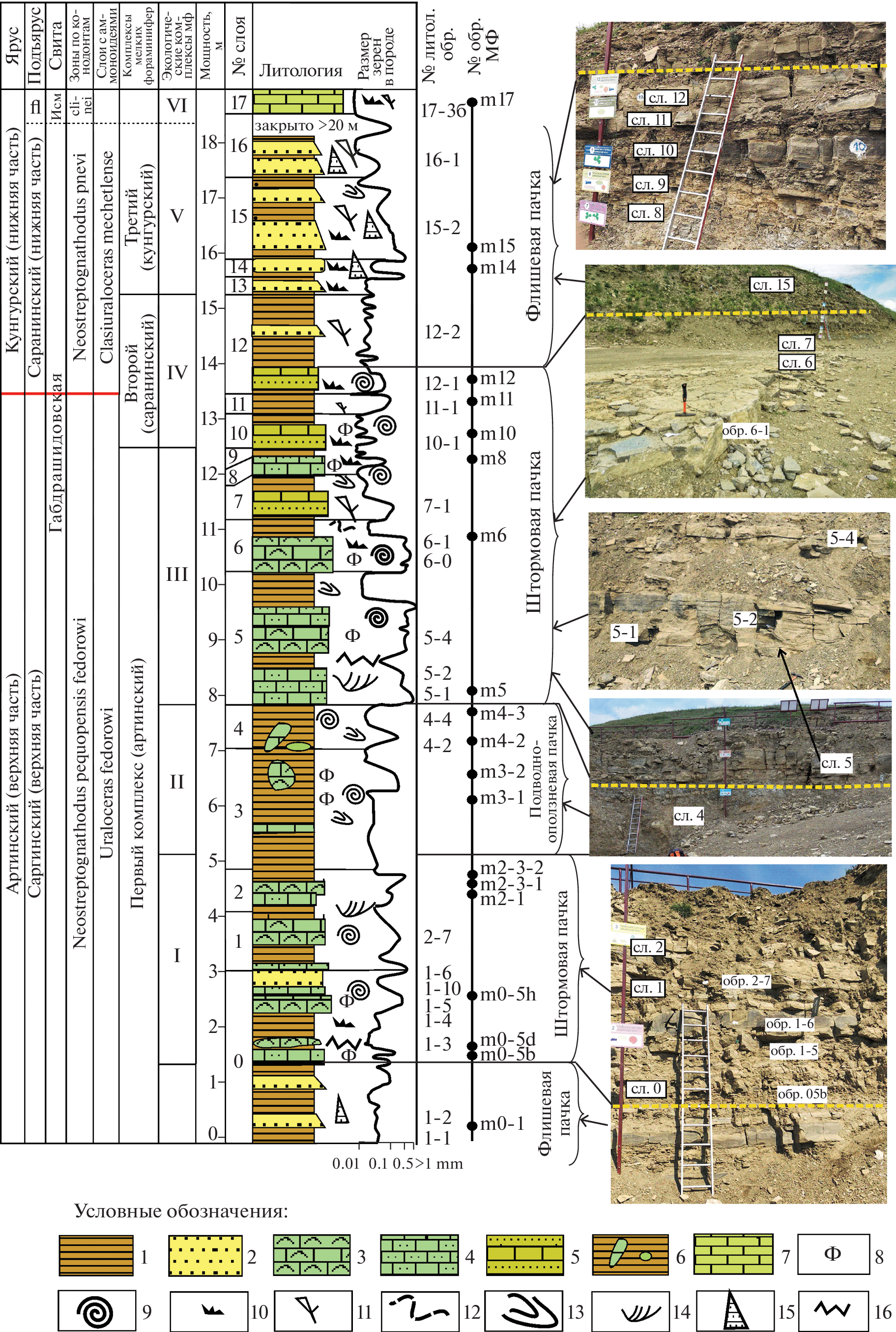 A lithofacies and bionomic study of the boundary Artinskian-Kungurian deposits of the Cisuralian Series of the Permian system in the Yuryuzan-Ai Depression was carried out on the example of the Mechetlino section (Southern Urals). The section was a candidate GSSP of the lower boundary of the Kungurian. In terrigenous-carbonate deposits, eight lithophacial types of rocks – lithofacies – are identified. According to their combination, the section is divided into packages composed of carbonate-terrigenous flysch rocks, carbonate clastic deposits initiated by storms, and blocky underwater landslide deposits. Six ecological complexes of small foraminifera are identified, reflecting sedimentation conditions in the areas of benthic fauna denudation. The mechanisms of mixing and movement of plant remains, benthic, planktonic and nectonic fossils are indicated. A model of the formation of sedimentary complexes of the Lower Permian in the Yuryuzan-Ai depression of the Pre-Ural trough is proposed, reflecting the bionomic specificity of the complexes of organic residues on the border of the Artinskian and Kungurian stages.