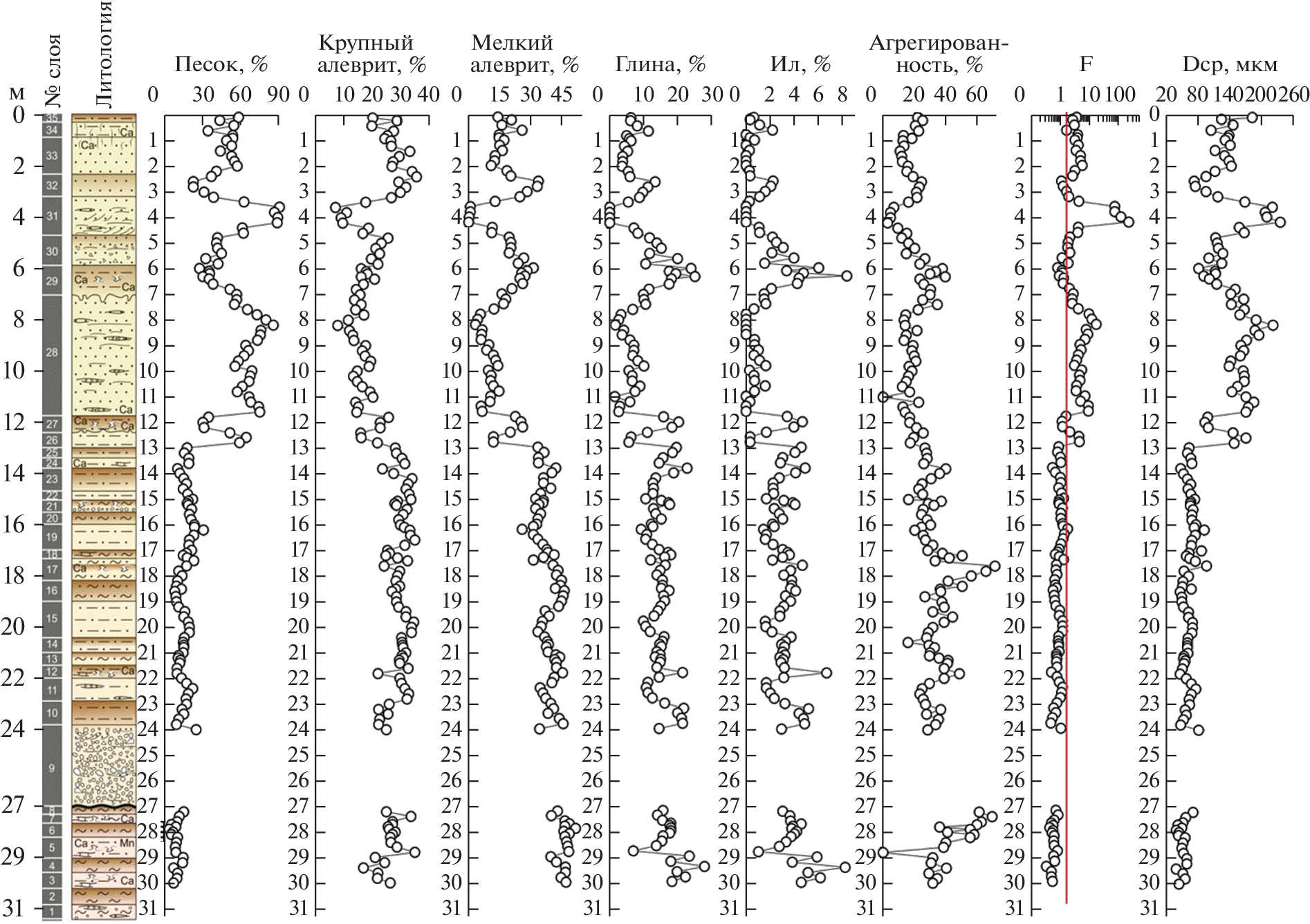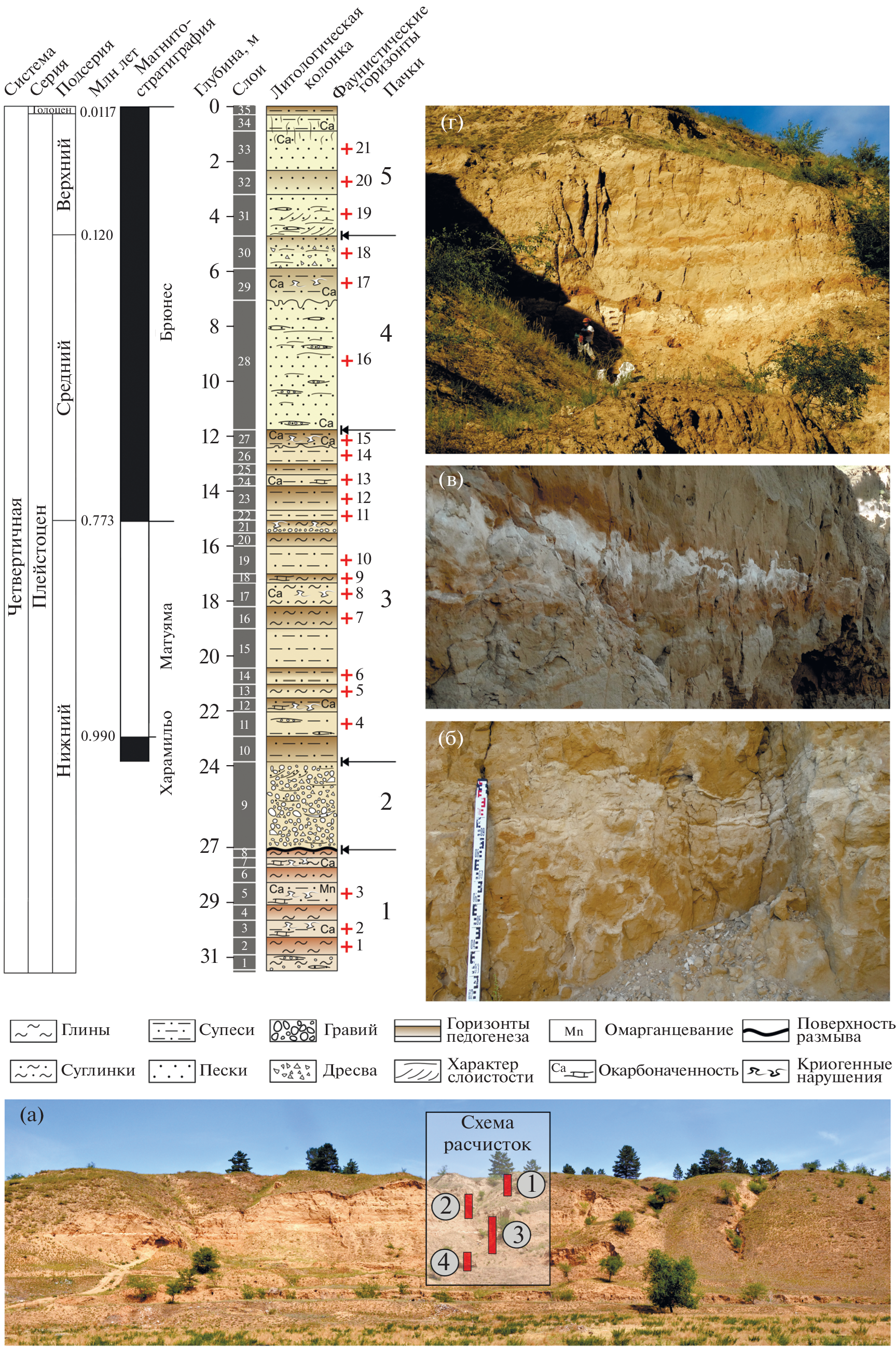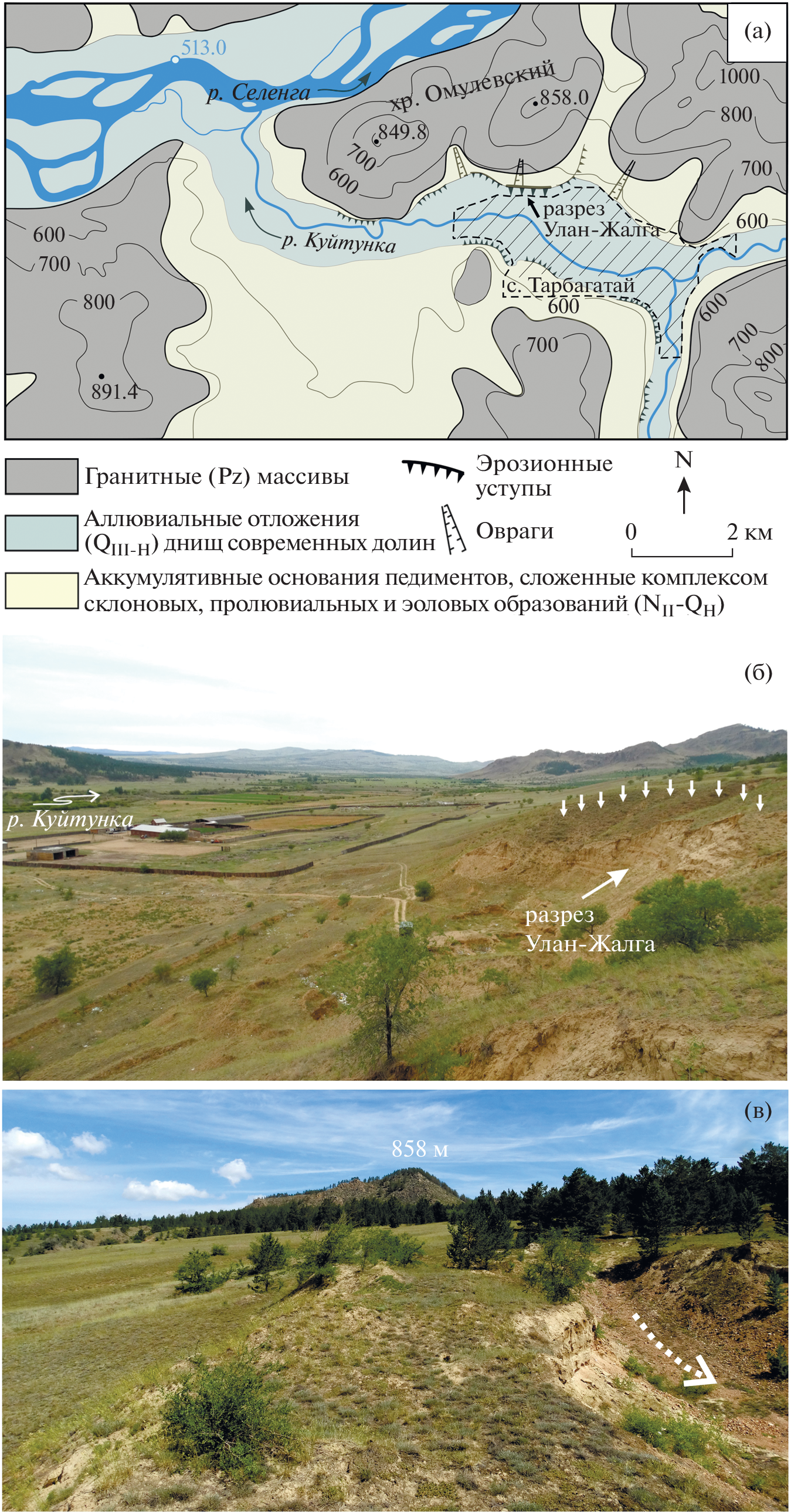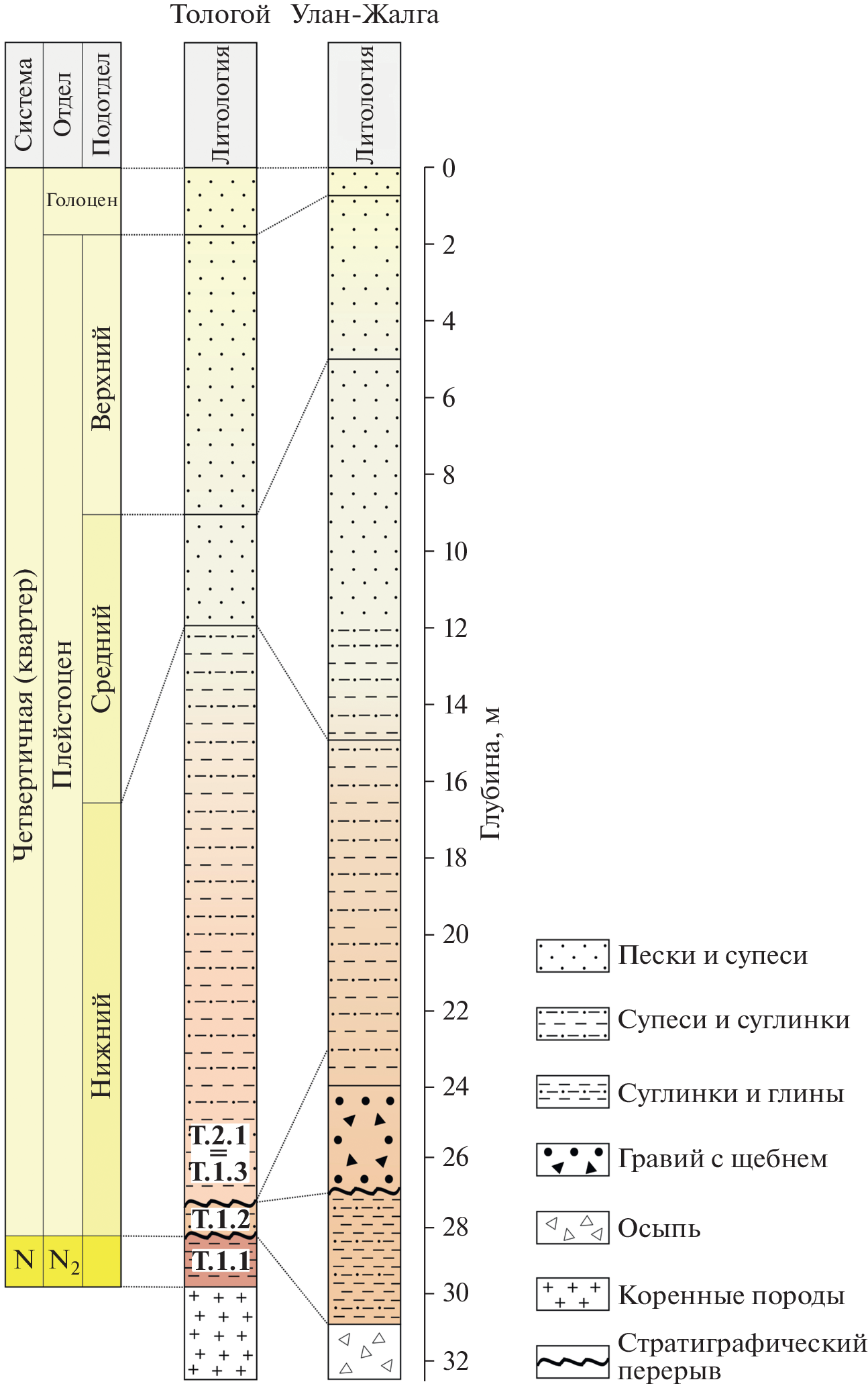 The results of a comprehensive study of the Upper Cenozoic Ulan-Zhalga reference section in western Transbaikalia are presented. The paleontological, paleomagnetic and rock magnetic, lithological-mineralogical, and geochemical data obtained allowed us to identify and characterize the Lower, Middle, and Upper Pleistocene and Holocene deposits in the section and to reveal the features and conditions of sedimentation. Five members recognized in the section are combined into two sequences: the lower (layers 1–27, units 1–3) and the upper (layers 28–35, units 4–5). The boundary between Matuyama and Brunhes chrons (0.773 Ma) is determined at a depth of 15 m and the upper boundary of the Jaramillo subchron (0.990 Ma) at a depth of 23 m. The Matuyama/Brunhes boundary coincides with the boundary of Lower and Middle Pleistocene faunal complexes. The formation of the section corresponds to two major stages of sedimentation, which boundary is between the units 3 and 4 (depth 11.8 m). Changes in rock magnetic and granulometric parameters over the section has a climatic nature and reflect environmental changes. The formation of the lower part of the section (unit 1), which was accompanied by active pedogenesis, is characterized by the most heat- and moisture-enriched conditions. The upper strata of the section accumulated in colder and drier conditions with increased dynamics of aeolian processes.