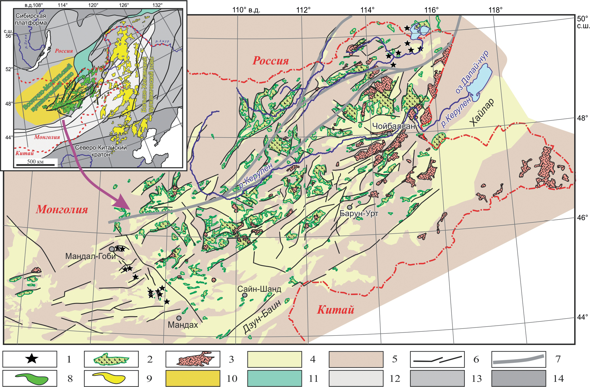 Территория Центральной и Восточной Монголии сформировалась в результате аккреционных процессов, протекавших в связи с образованием Центрально-Азиатского и Монголо-Охотского складчатых поясов, а также Тихоокеанской активной континентальной окраины Азиатского континента (Parfenov et al., 1999, 2010). Структурный каркас территории определяют (по Badarch et al., 2002): палеопротерозойский Эрендабанский, неопротерозойский Идэрмекский и раннепалеозойские Керуленский и Мандалгобийский террейны, объединенные в результате раннепалеозойской аккреции в общий континентальный блок, структуры которого выделяются также как Центрально-Монгольская зона (Тектоника…, 1974). Блок с юга граничил с Палеоазиатским океаном, а с севера с Монголо-Охотским бассейном.