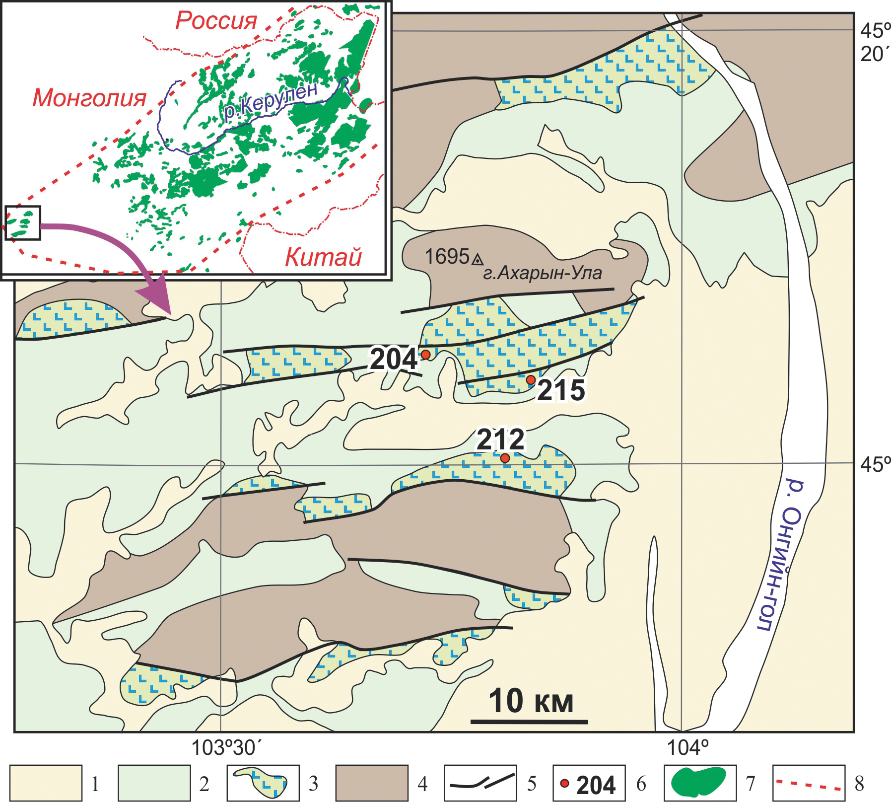 В средней–поздней юре территория Восточной Монголии находилась в области развития процессов, действовавших, во-первых, со стороны завершавшейся коллизии в зоне Монголо-Охотского бассейна и, во-вторых, со стороны Тихоокеанской конвергентной границы Азиатского континента. С последними связывается заложение магматического пояса Большого Хингана (Faure, Natalin, 1992; Zhang J. et al., 2008, 2010; Ouyang et al., 2015; Deng et al., 2019) (врезка на рис. 1), протянувшегося поперек структур Центрально-Монгольской зоны вблизи границы Монголии и Китая. К середине юры Монголо-Охотский пояс завершил свое формирование (Sorokin et al., 2020). Еще небольшие остаточные седиментационные бассейны сохранялись в поздней юре в Западном и Восточном Забайкалье (Arzhannikova et al., 2022), а основная территория Восточной Монголии оказалась во внутриконтинентальной части Азии, расположенной в удаленном тылу Тихоокеанской активной континентальной окраины. Однако именно здесь на протяжении раннего мела протекали интенсивные магматические процессы, сформировавшие Восточно-Монгольский вулканический пояс.