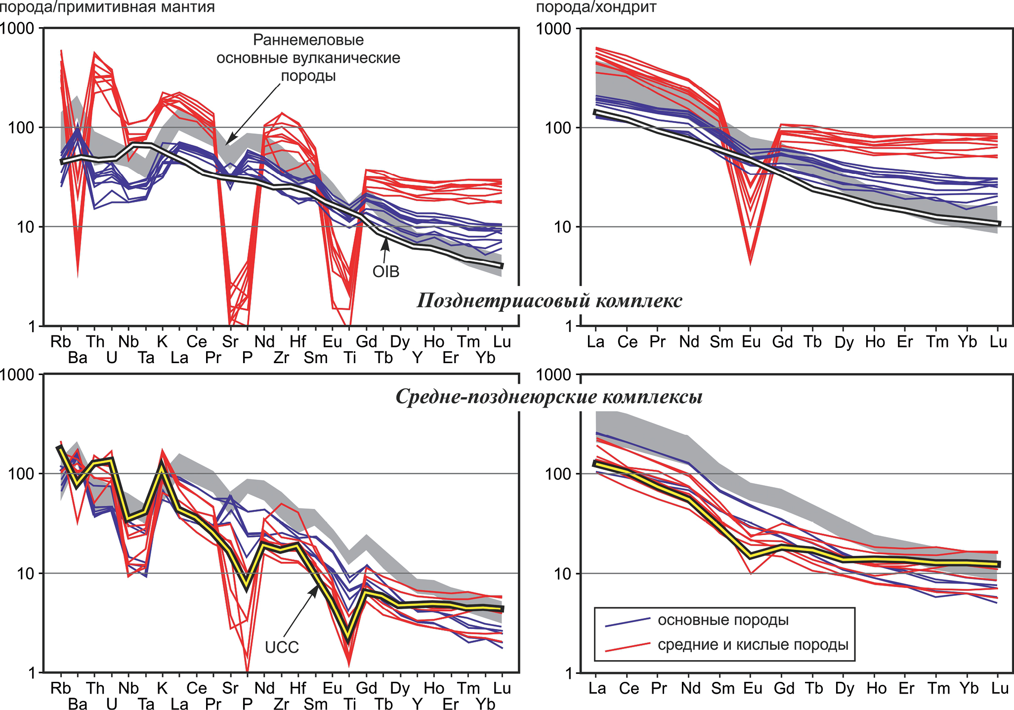 Позднетриасовые магматические комплексы широкое развитие получили к западу от ВМВП в районе гор Ахарын-Ула. Они характеризуются значениями возраста около 215 млн лет и представлены бимодальными базальт-щелочно-риолитовыми вулканическими ассоциациями, формирование которых было связано с образованием раннемезозойского Хэнтей-Даурского зонального магматического ареала. Внешние зоны ареала частично захватили ту территорию, в пределах которой позднее сформировался позднемезозойский ВМВП. Эти зоны, выделяемые также как зоны распыленного магматизма (Коваленко и др., 1984), характеризуются развитием субщелочных и щелочных гранитоидов, формирование которых происходило в то же время, что и пород района гор Ахарын-Ула (Ярмолюк и др., 2019а). Специфика магматизма зонального магматического ареала связывается с его формированием под воздействием мантийного плюма, вызвавшего крупнообъемное коровое плавление в центральной части ареала (Хэнтей-Даурский батолит) и сформировавшего зоны рифтогенеза по его обрамлению. Образование бимодальных магматических ассоциаций в зонах рифтогенеза контролировалось механизмами дифференциации базальтовых магм плюмовой природы.